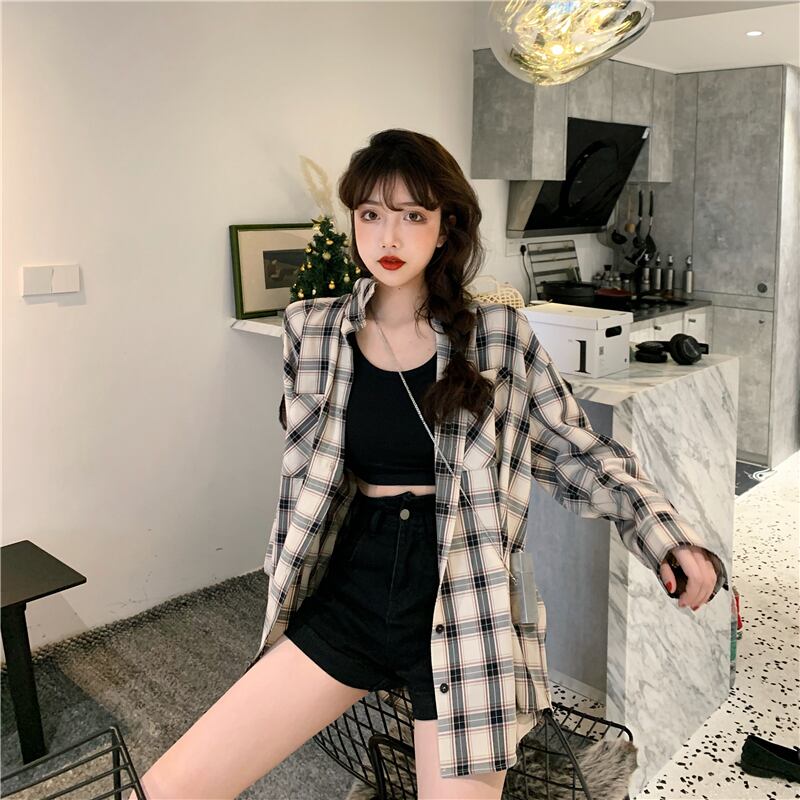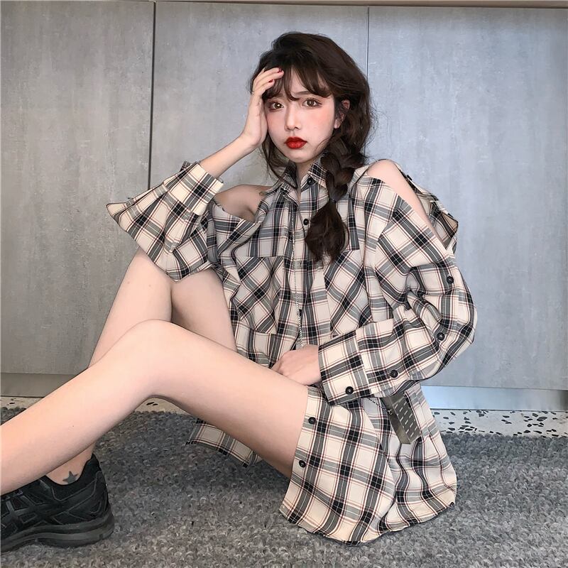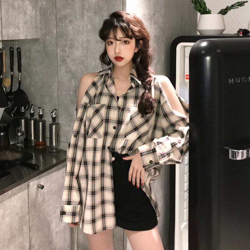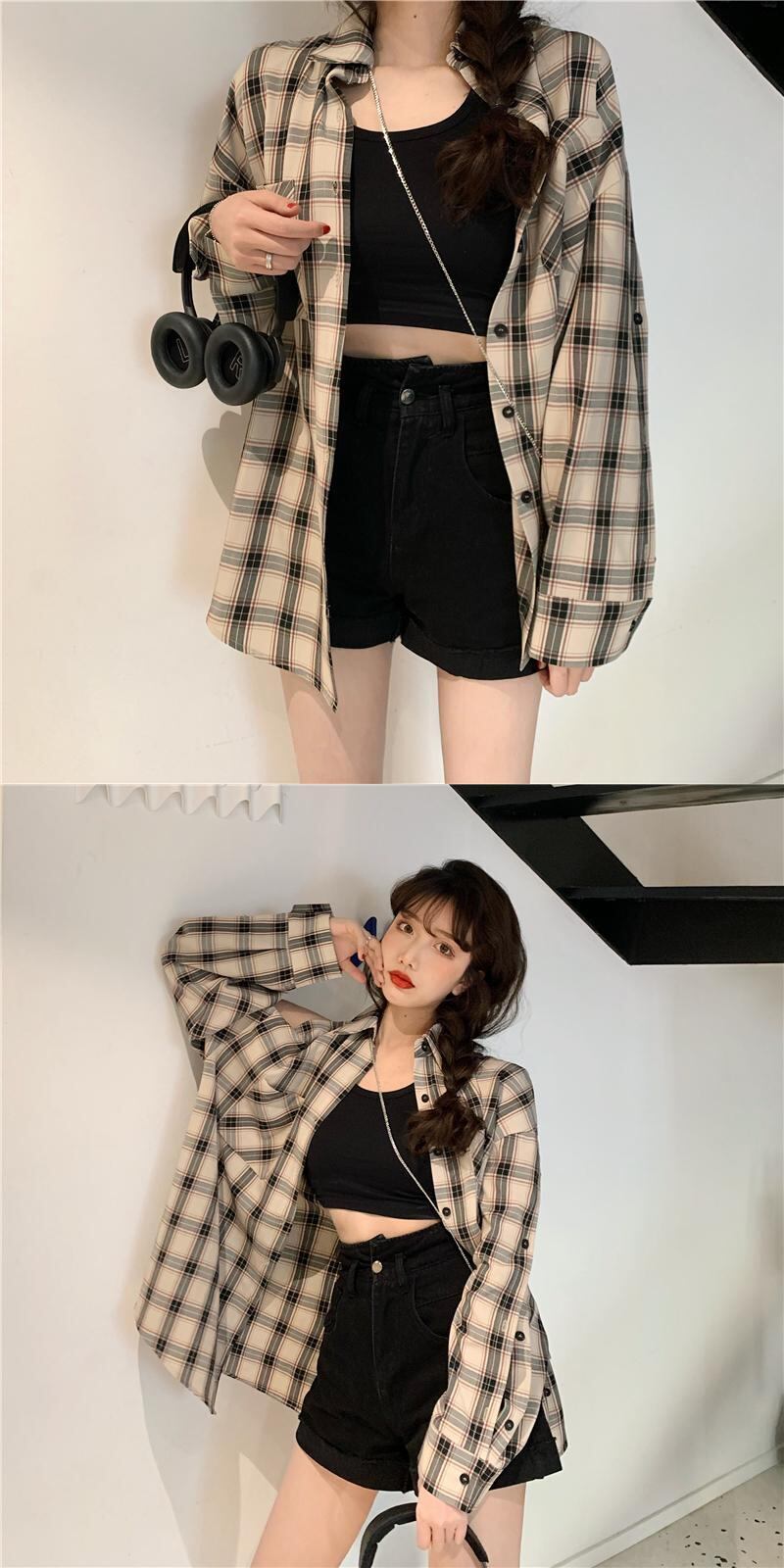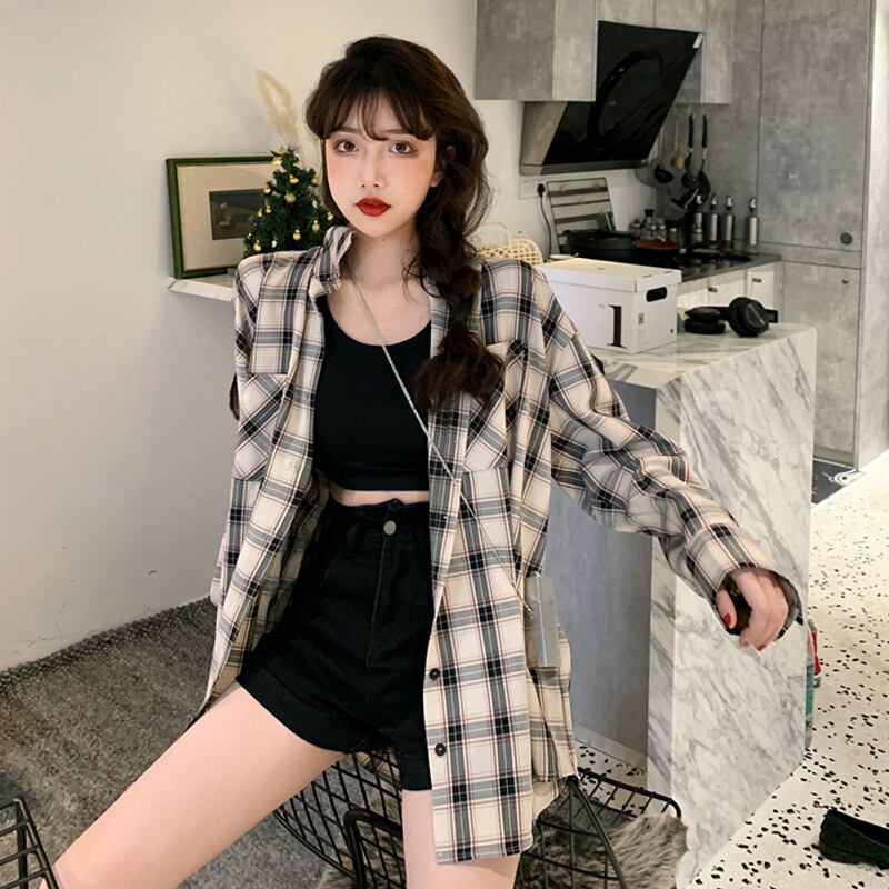 格子柄シャツ ジャケット スプリングスタンダードトップス ロング レトロ 春物 長袖 SYJ38395048081