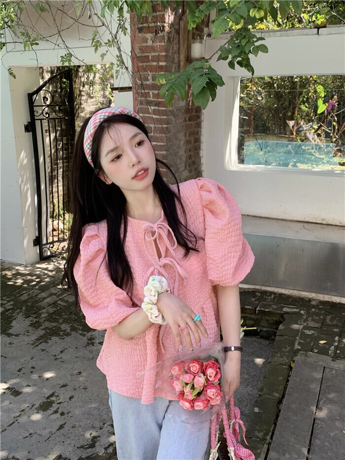 韓国ファッションショートトップス 夏服スリーブシャツ ピンク 夏物 SYJ96974271770