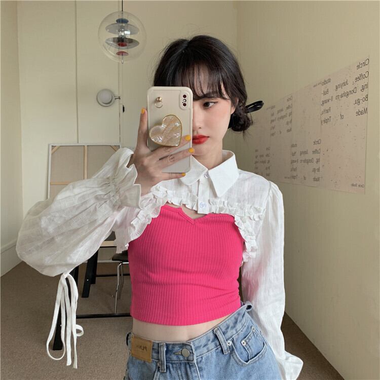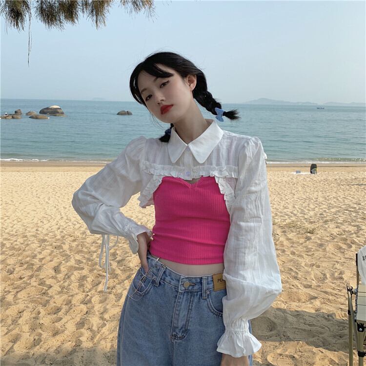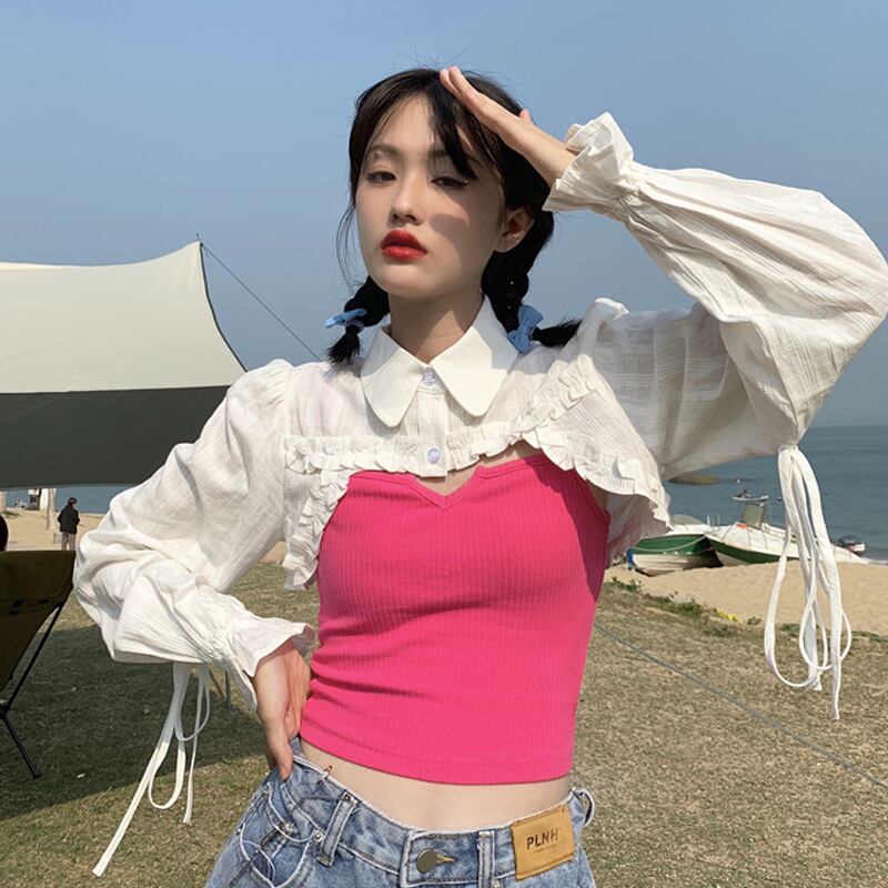 ホワイトショートブラウス トップス スプリングシャツ ロング 春物 長袖 SYJ40497633793