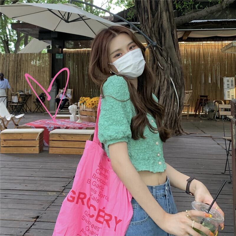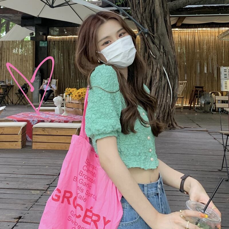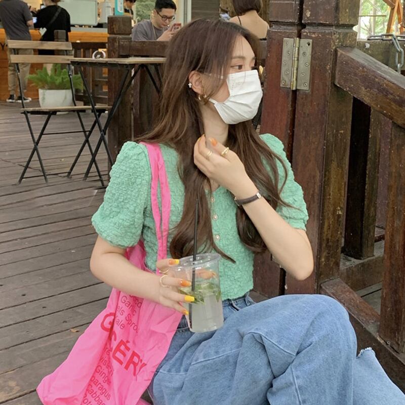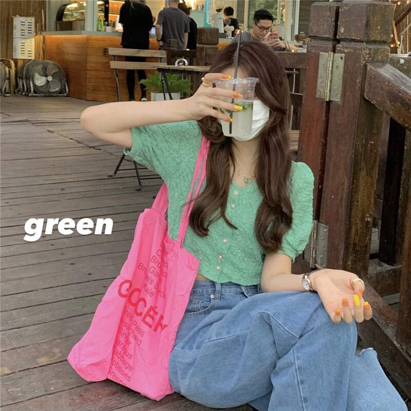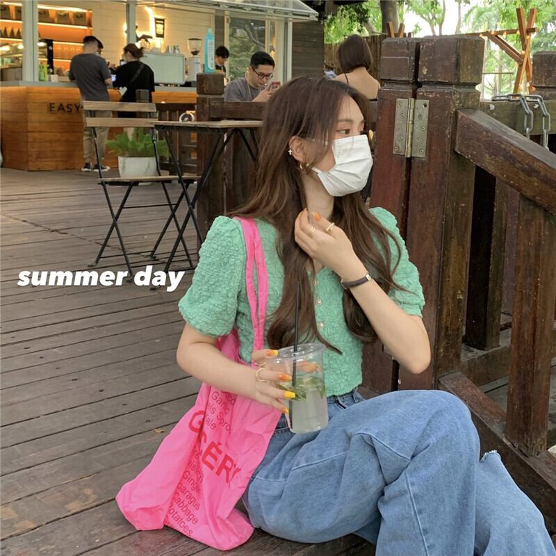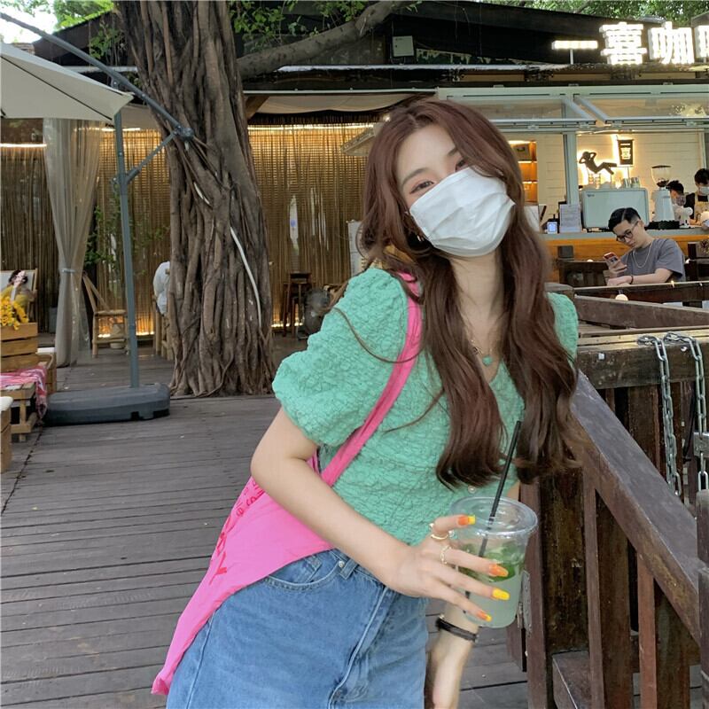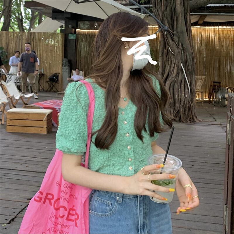 グリーンVネックスリーブシャツ 夏服ショートトップス 大人ガーリー スウィート キュート カジュアル 夏物 SYJ99286883920