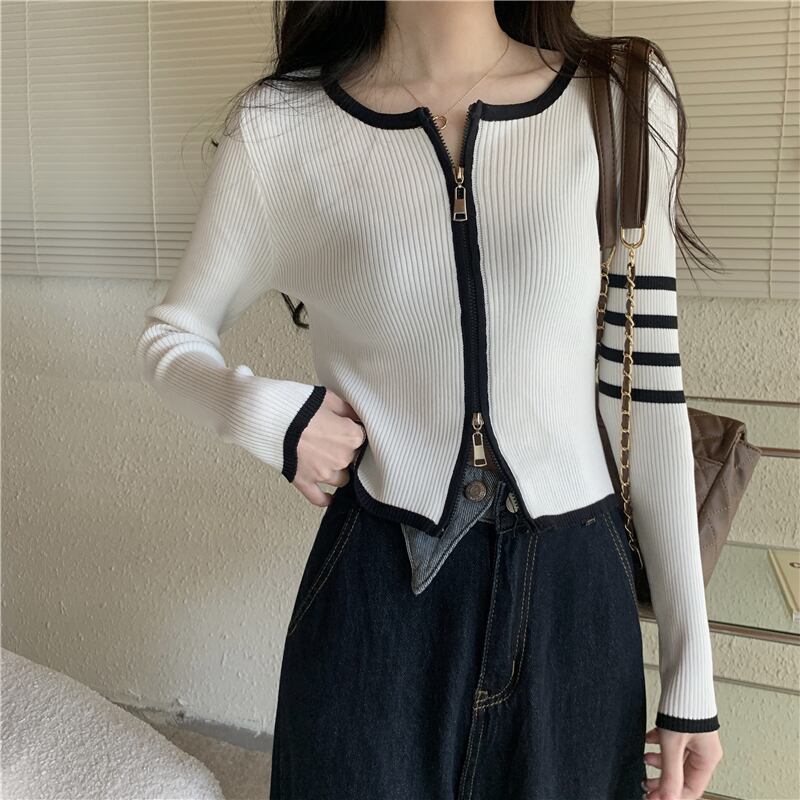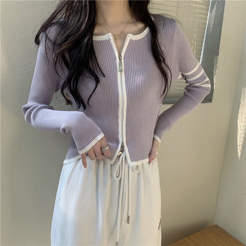 ジッパーニットカーディガンスプリングショートトップス 大人ガーリー スウィート キュート カジュアル 春物 パープル SYJ84620917062