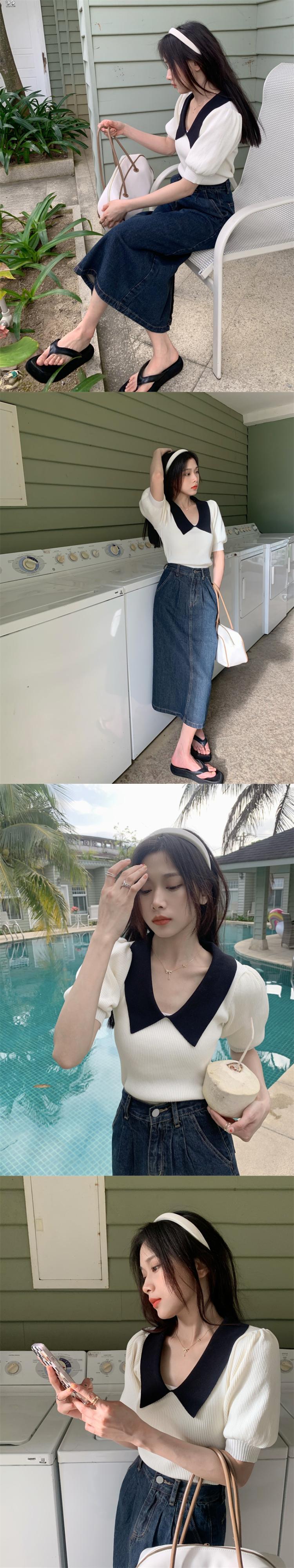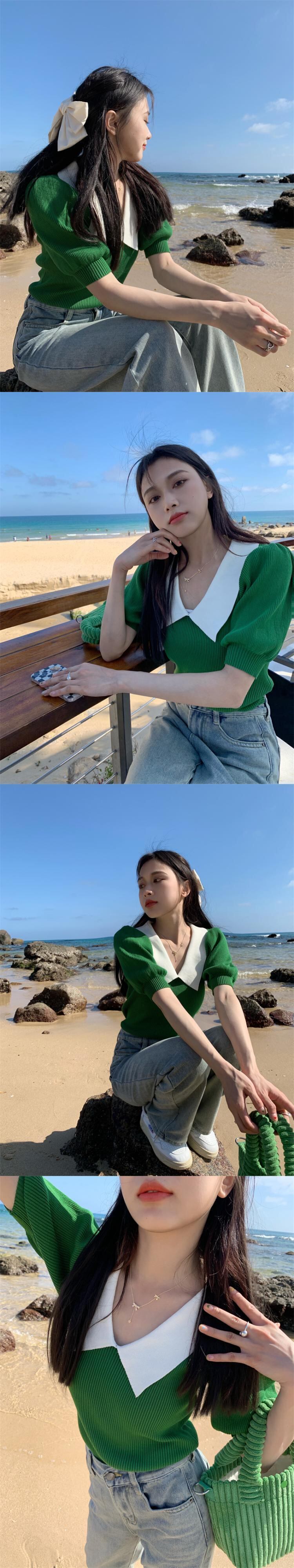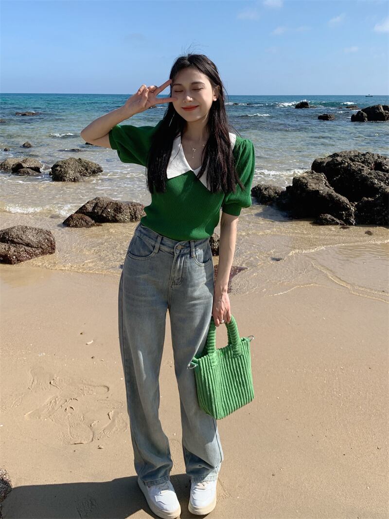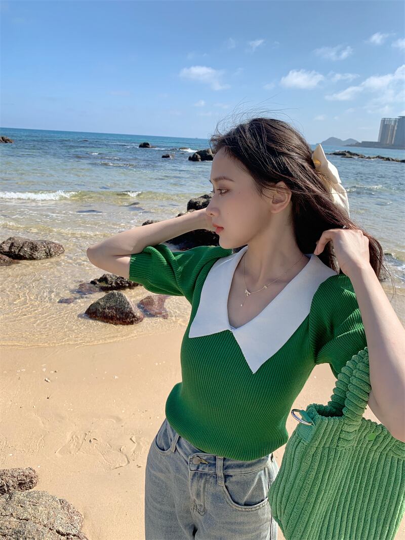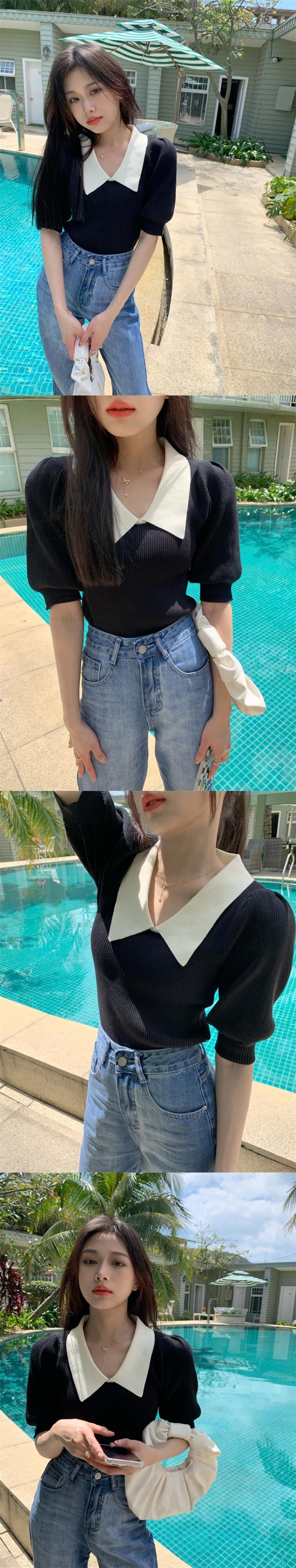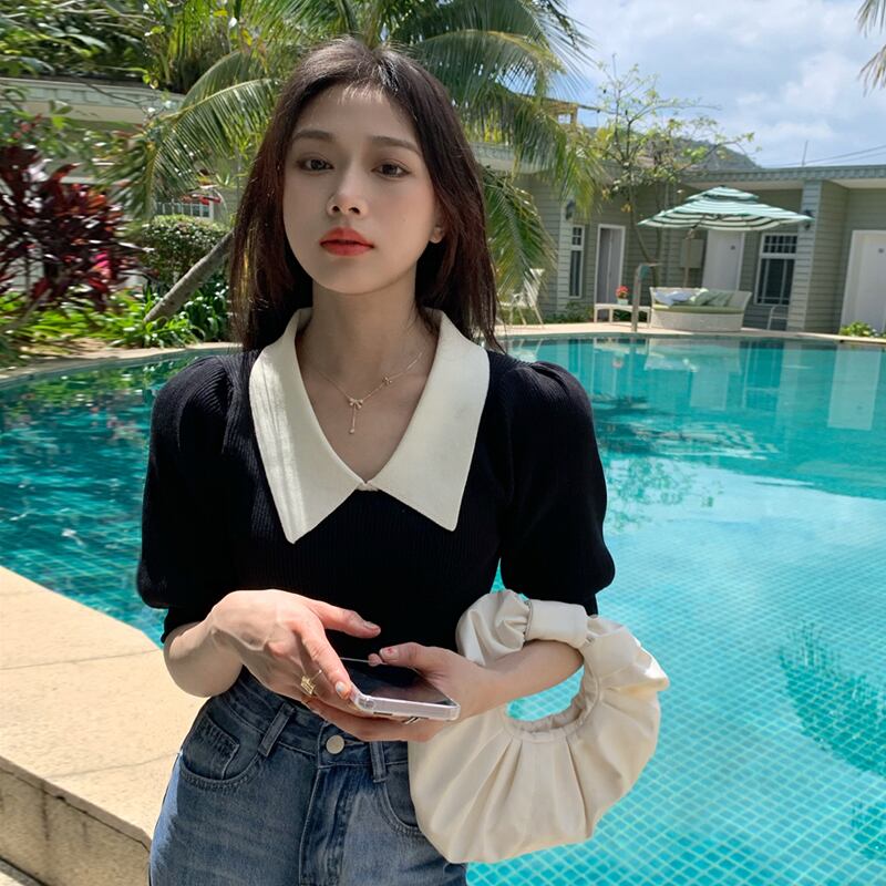ホワイトニット夏服スリムトップス 夏物 パフスリーブ SYJ15645864150