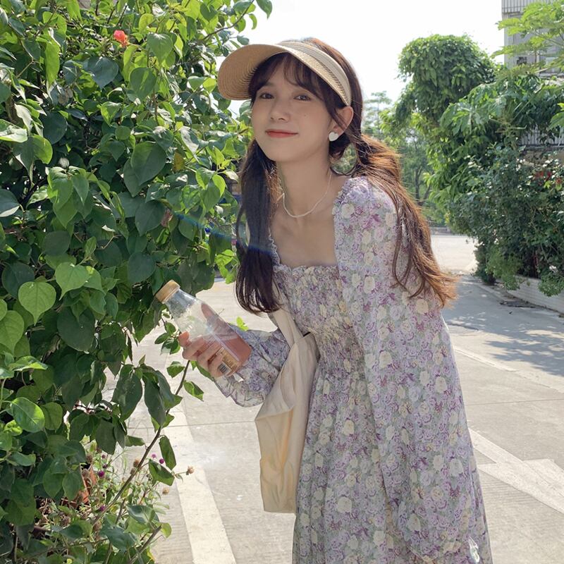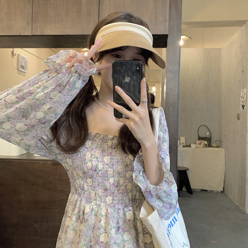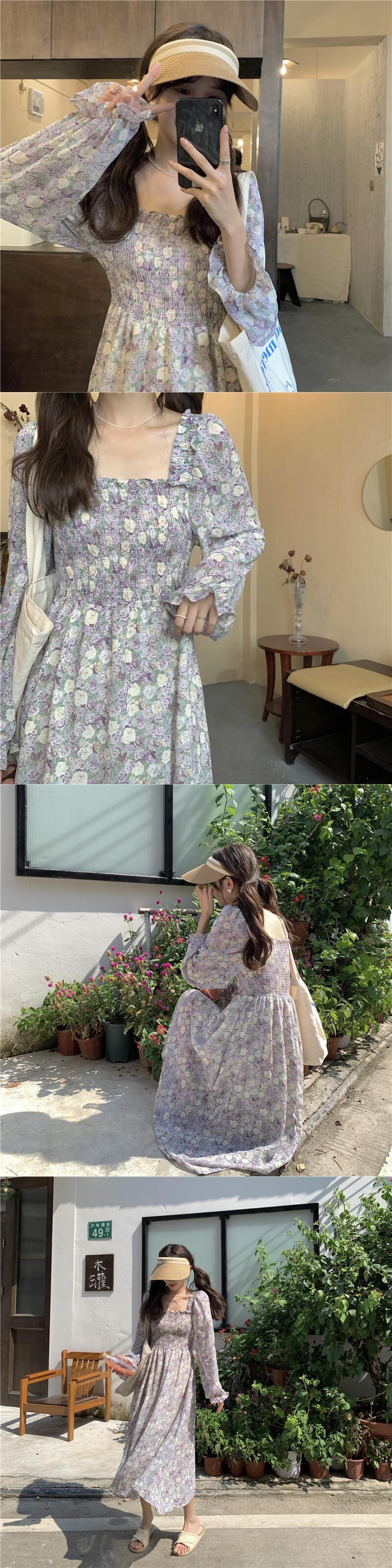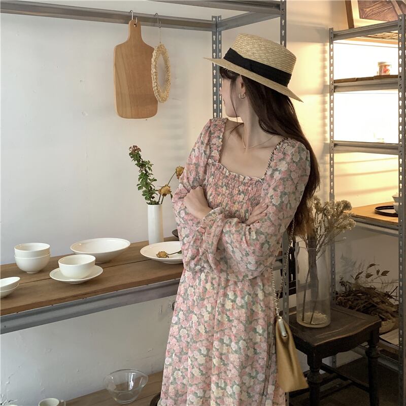 フローラルシフォンワンピーススプリング秋物スカート ロング 大人ガーリー スウィート キュート カジュアル 春物 オータム 花柄 長袖 SYJ65737612563
