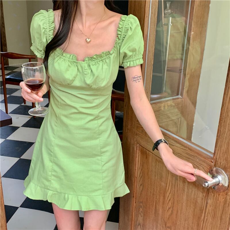 グリーンワンピース夏服スリムショートスカート 大人ガーリー スウィート キュート カジュアル 夏物 ピュア スクウェア SYJ43815257539