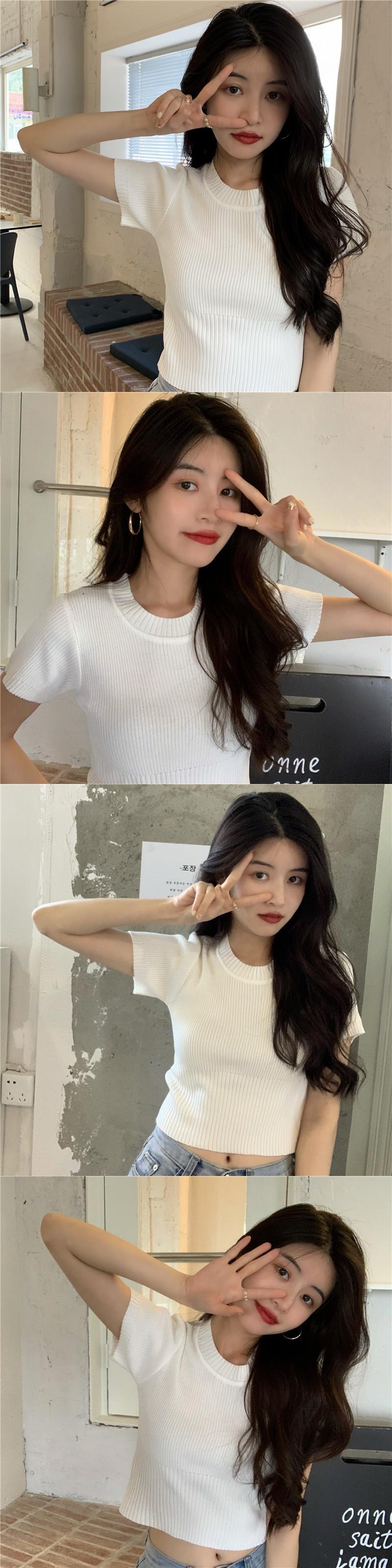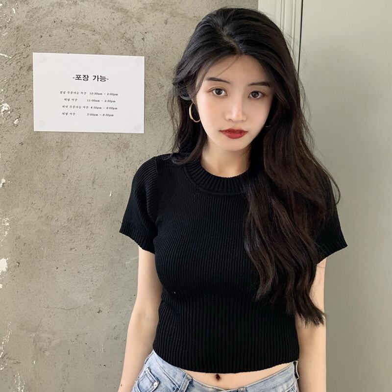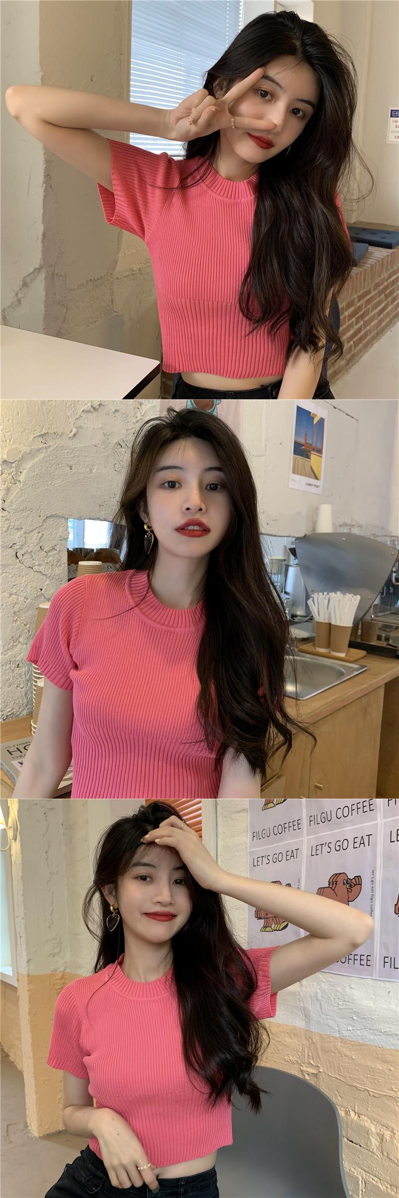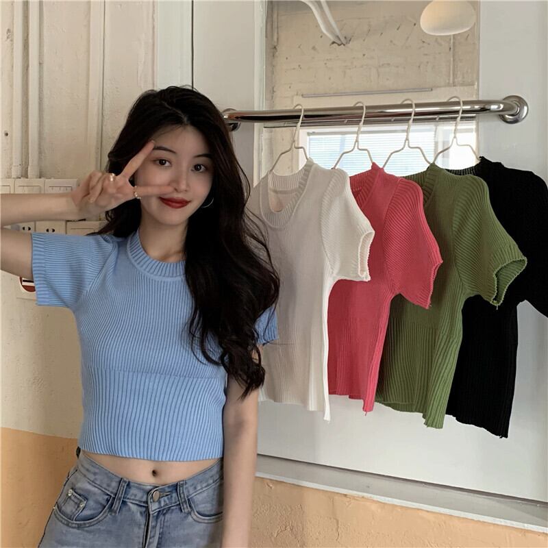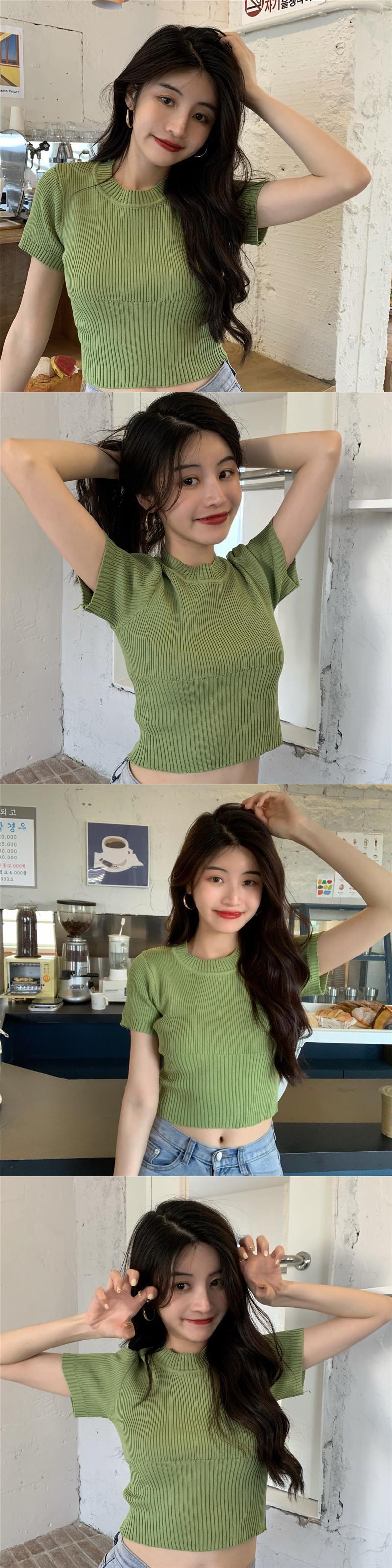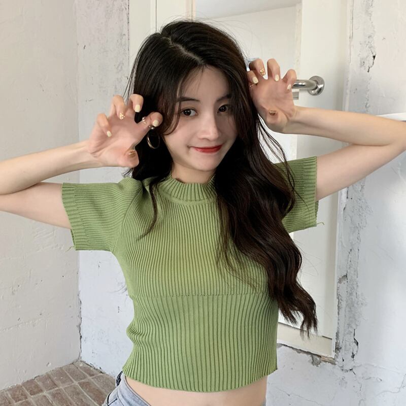 グリーンショートトップス 夏服ゆったりスリムニットセーター TシャツNEW 夏物 SYJ83044991971