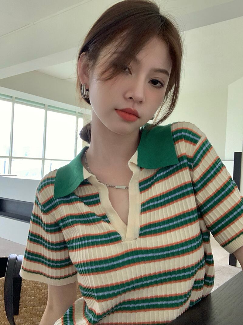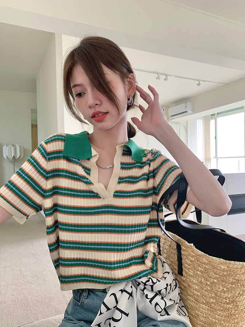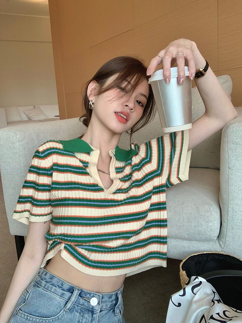 ショートトップス 夏服韓国ファッションストライプニットTシャツ 夏物 SYJ21338941806