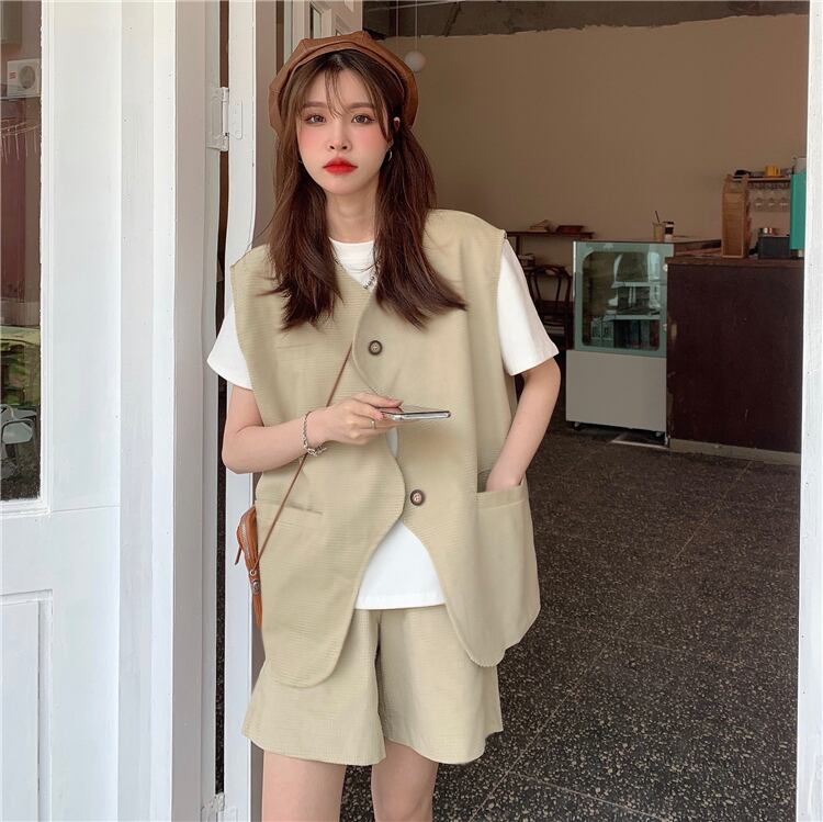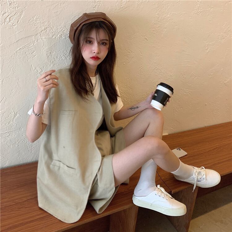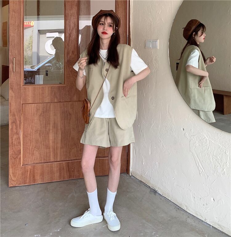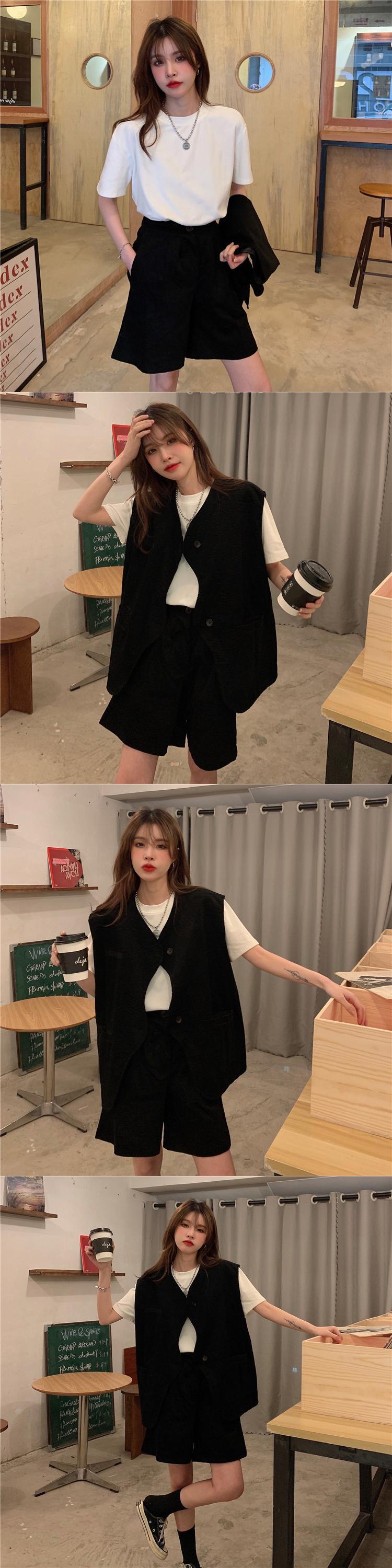 色:ホワイトTシングルピース,カーキ一枚,ブラックベストワンピース,カーキ色のパンツ,ブラックパンツワンピース