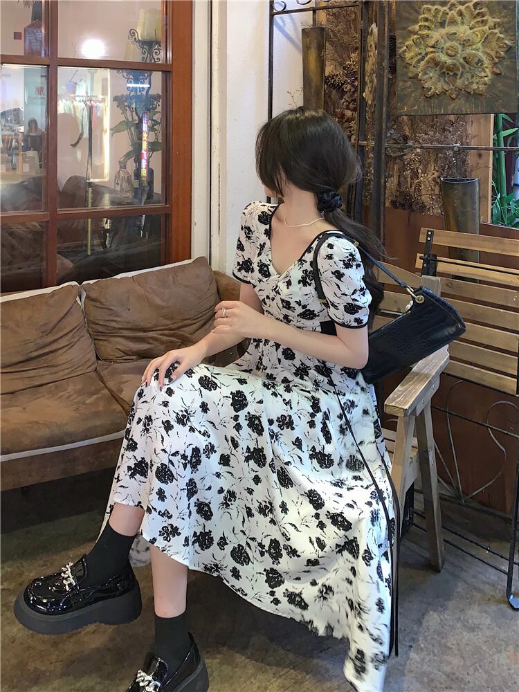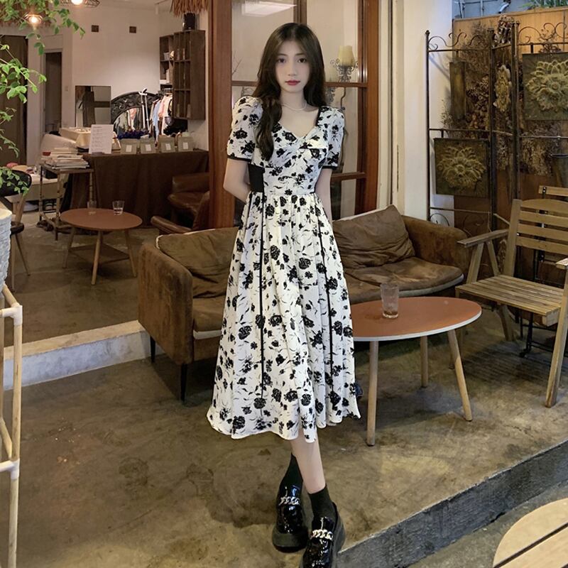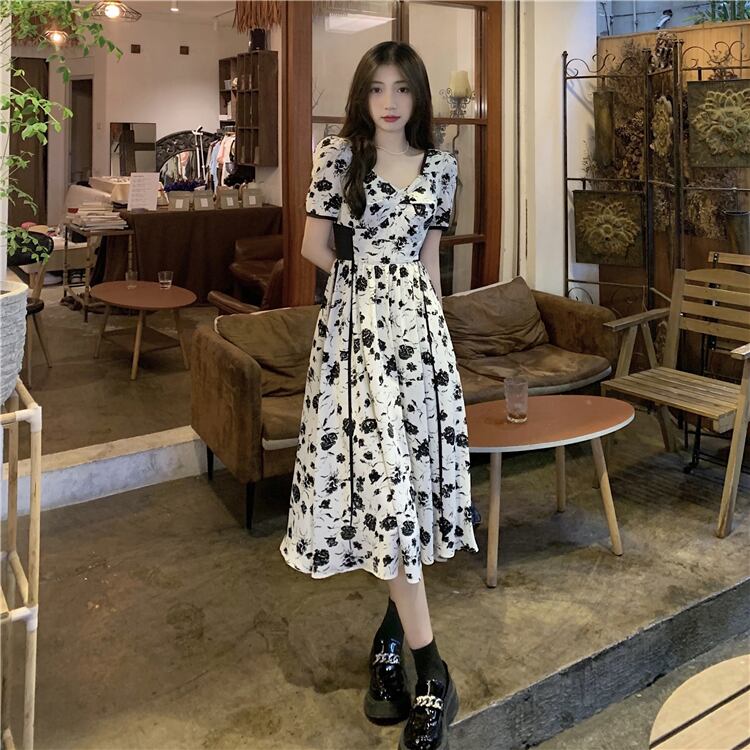 フローラルスリーブワンピース夏服スタンダードウェストスカート レトロ 夏物 花柄 ウエスト SYJ1085961896