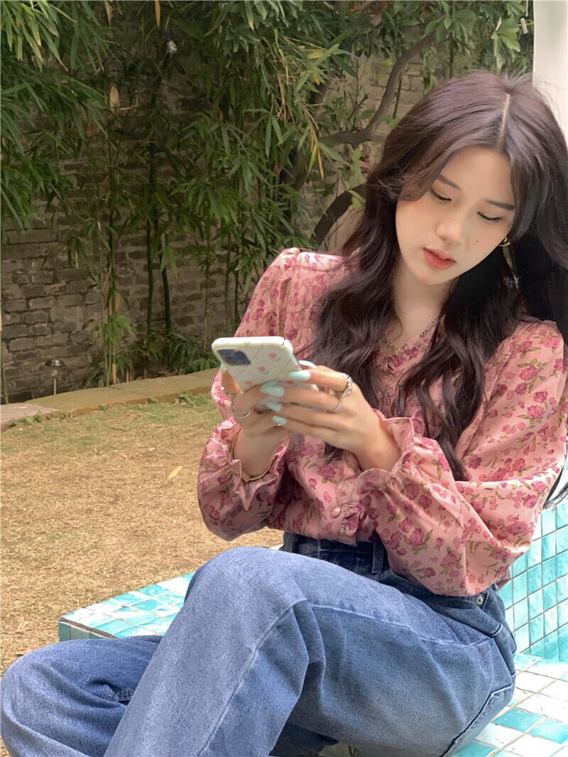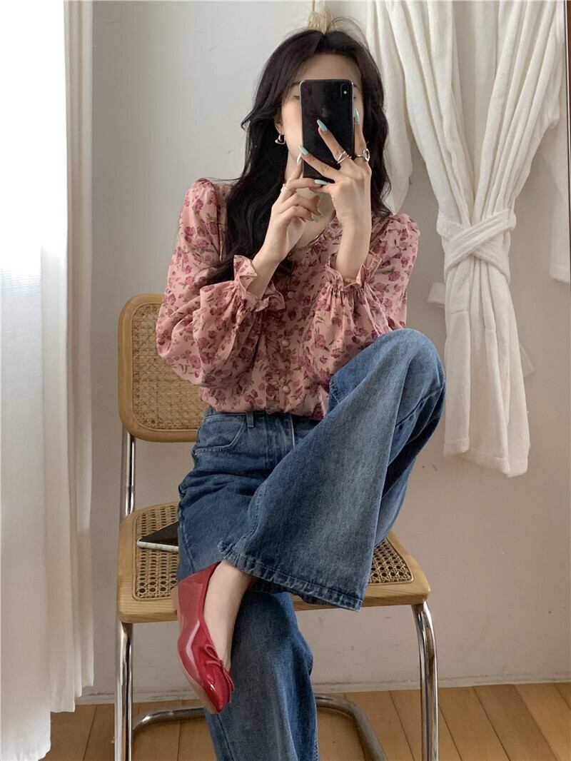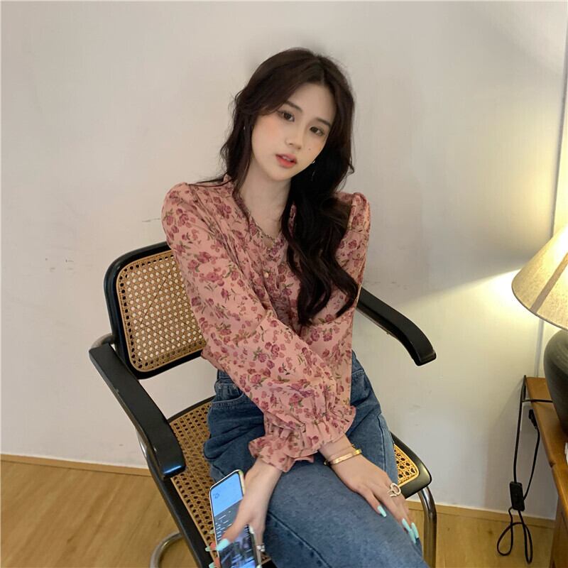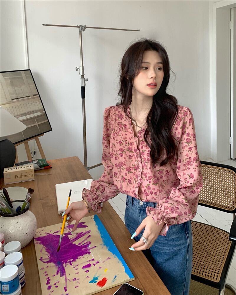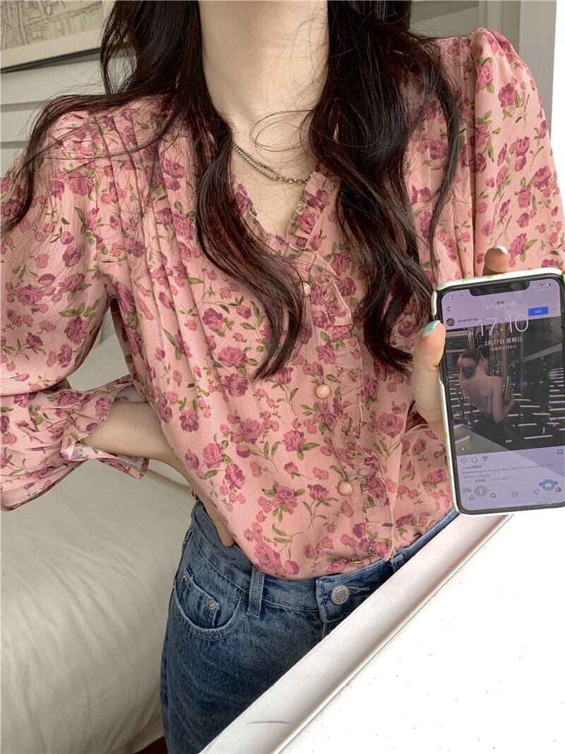 レッドシフォンフローラルシャツ スプリング韓国ファッショントップス 春物 花柄 SYJ72020027967
