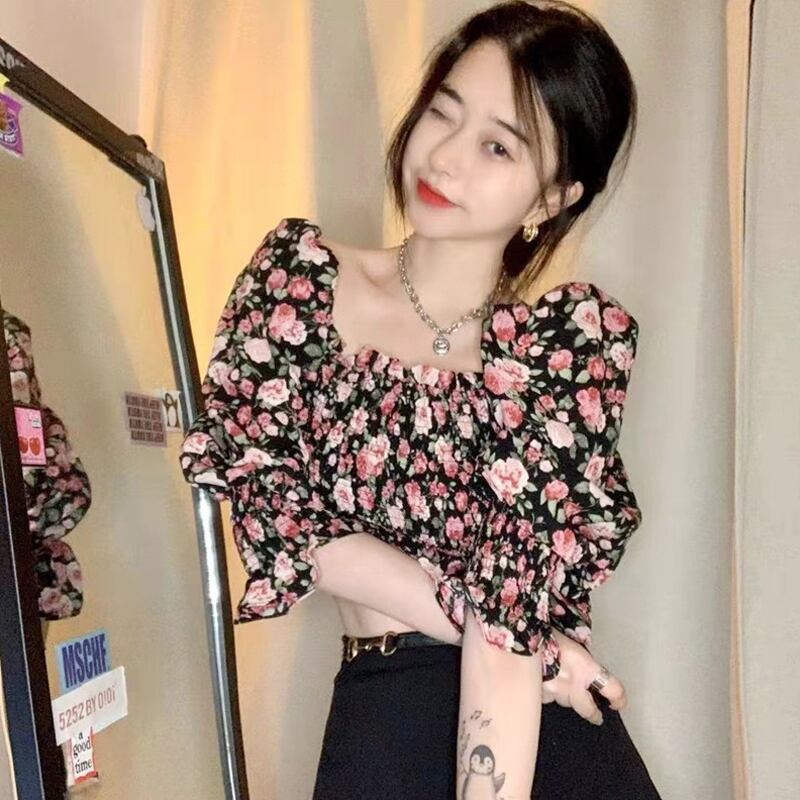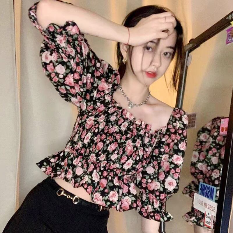 カラーショートトップス 夏服スリーブフローラルシャツ 大人ガーリー スウィート キュート カジュアル 夏物 花柄 スクウェア SYJ99149103136
