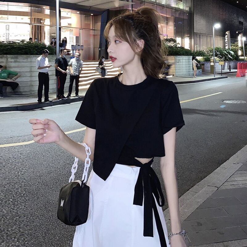 ブラック半袖スリーブTシャツ夏服トップス ショート ハーフスリーブ 大人ガーリー スウィート キュート カジュアル 夏物 SYJ98268714636