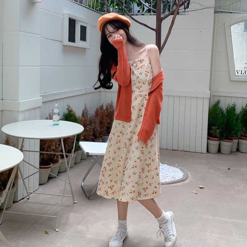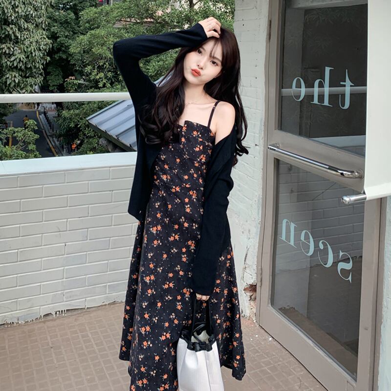 スタンダードフローラルコーデュロイワンピーススプリングロングスカート レトロ 春物 花柄 SYJ95319599847