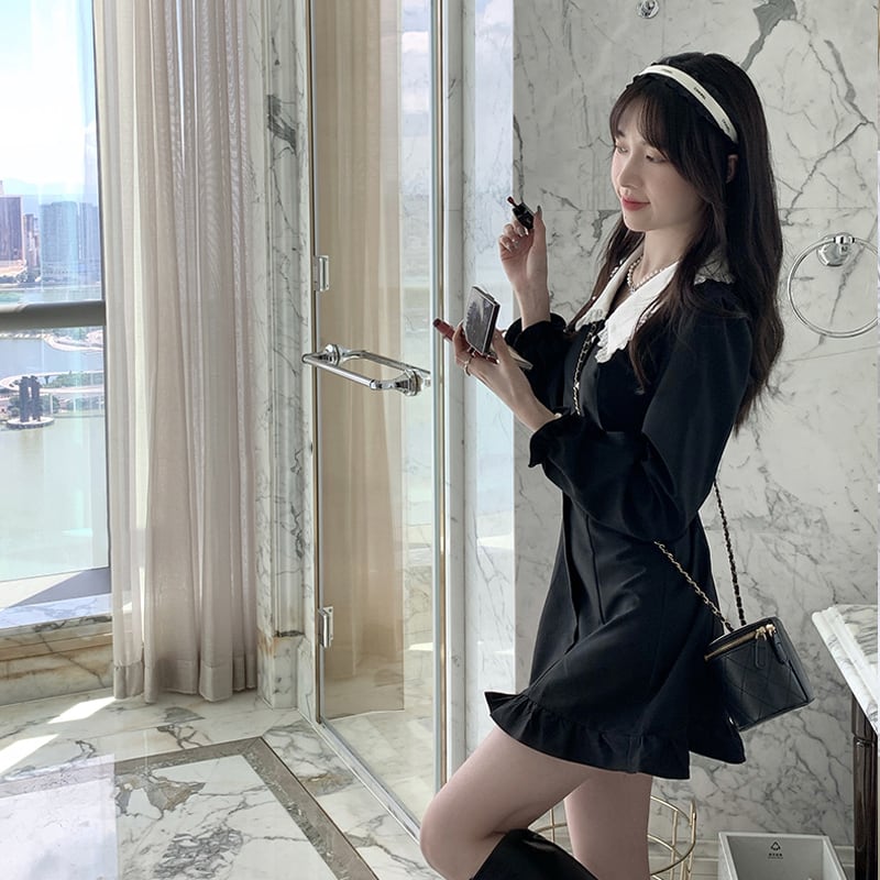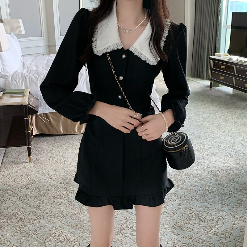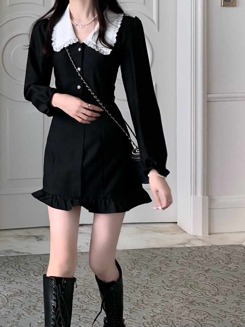 ブラックワンピーススプリング秋物ショートスカート ロング 大人ガーリー スウィート キュート カジュアル 春物 オータム 長袖 SYJ43004436814