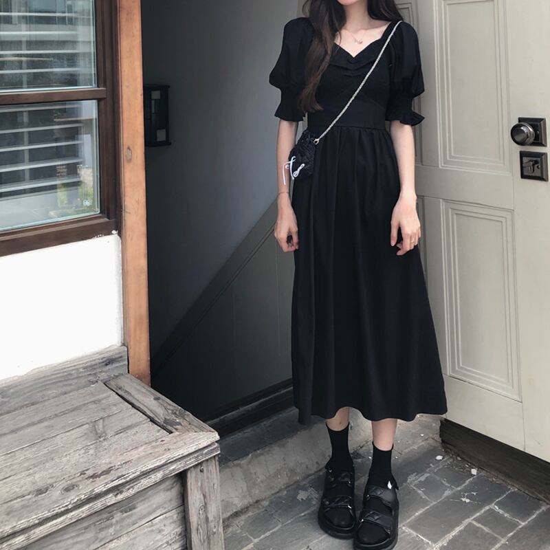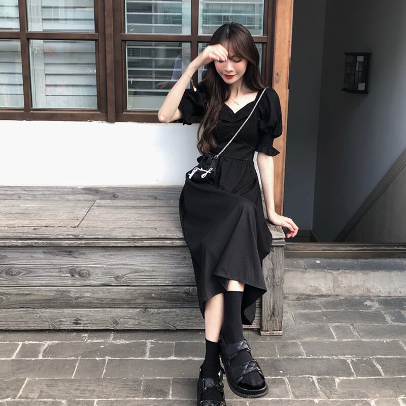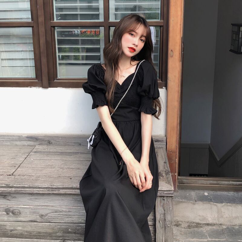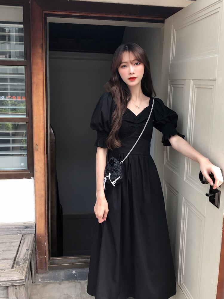 スタイルブラックスリーブミニ ワンピースワンピース夏服スタンダードロングスカート レトロ 夏物 SYJ60356360471