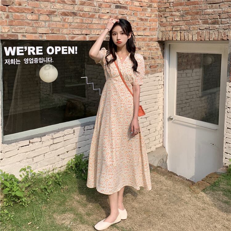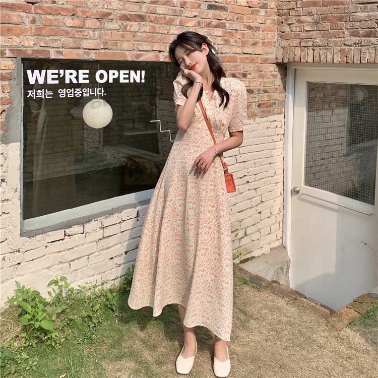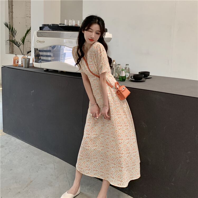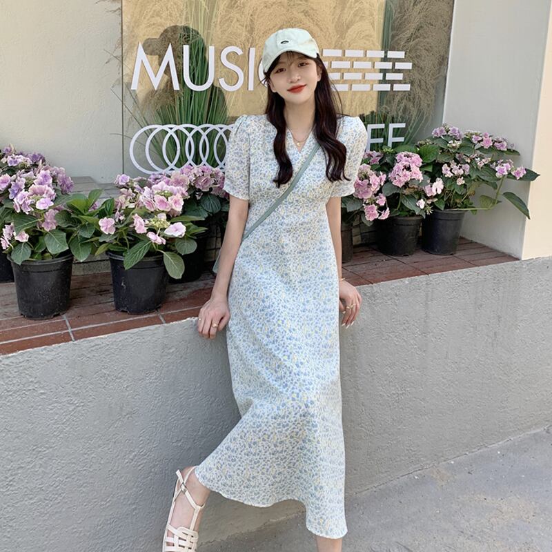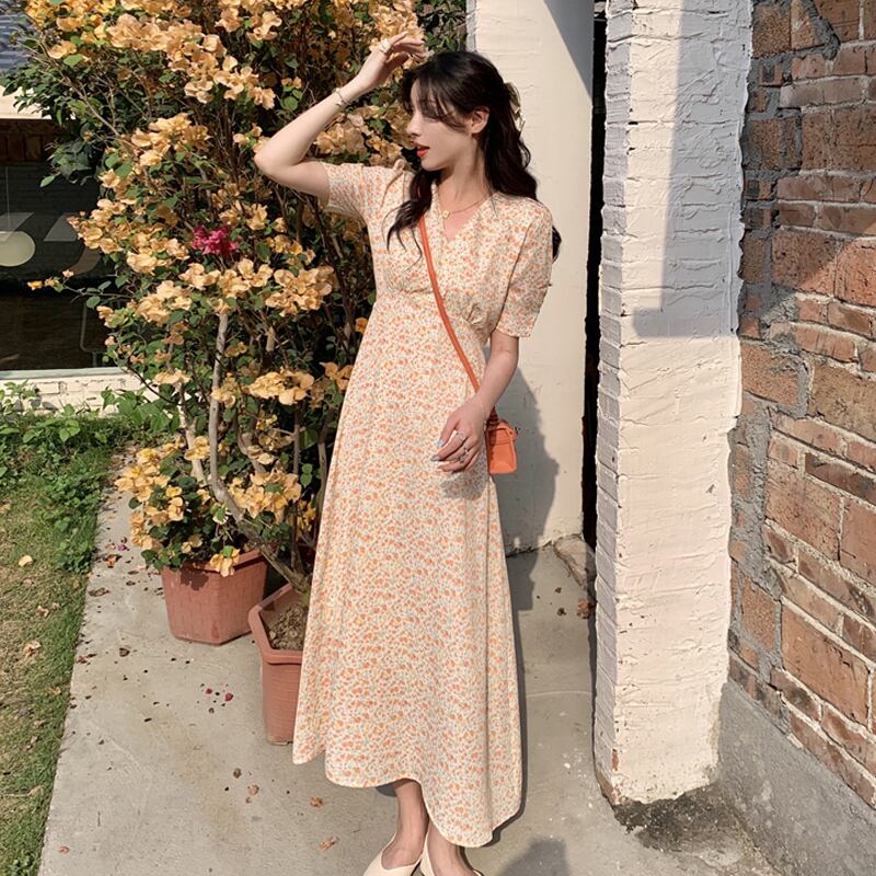 Vネックフローラルワンピース夏服スタイルロングスカート 大人ガーリー スウィート キュート カジュアル 夏物 花柄 SYJ69118478538