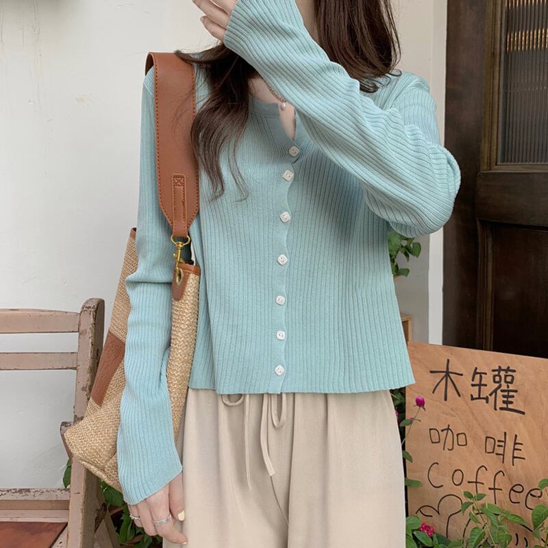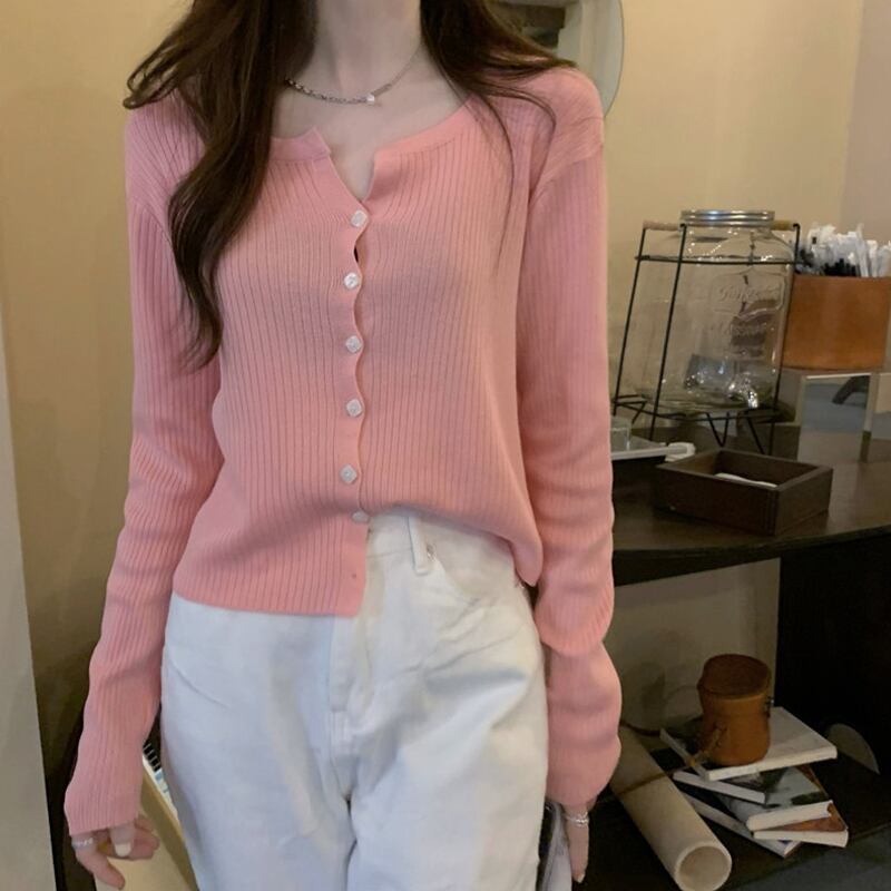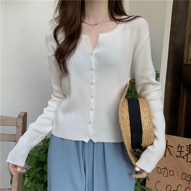 ホワイトニットカーディガンスプリングスタイル薄手トップス ロング 春物 長袖 SYJ30709040885
