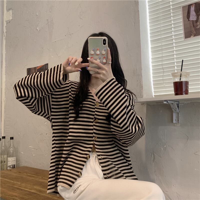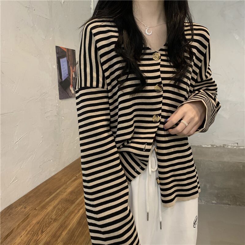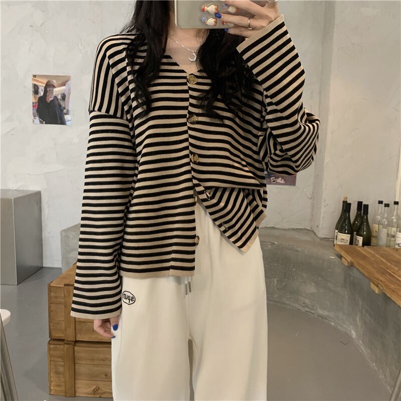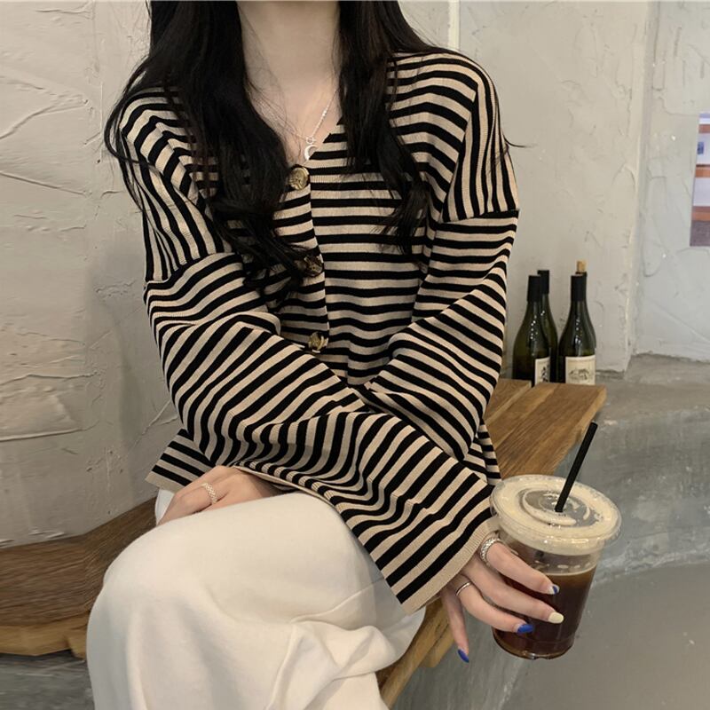 ストライプVネックセーター スプリングスタンダードルーズニットカーディガントップス レトロ 春物 SYJ97066977655