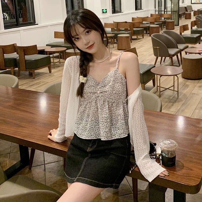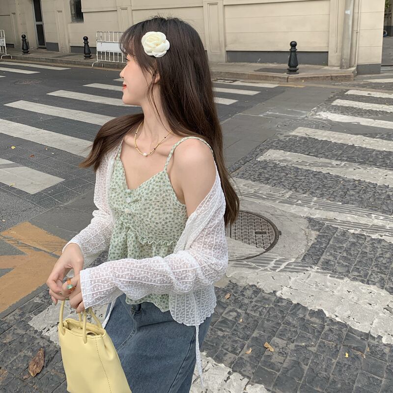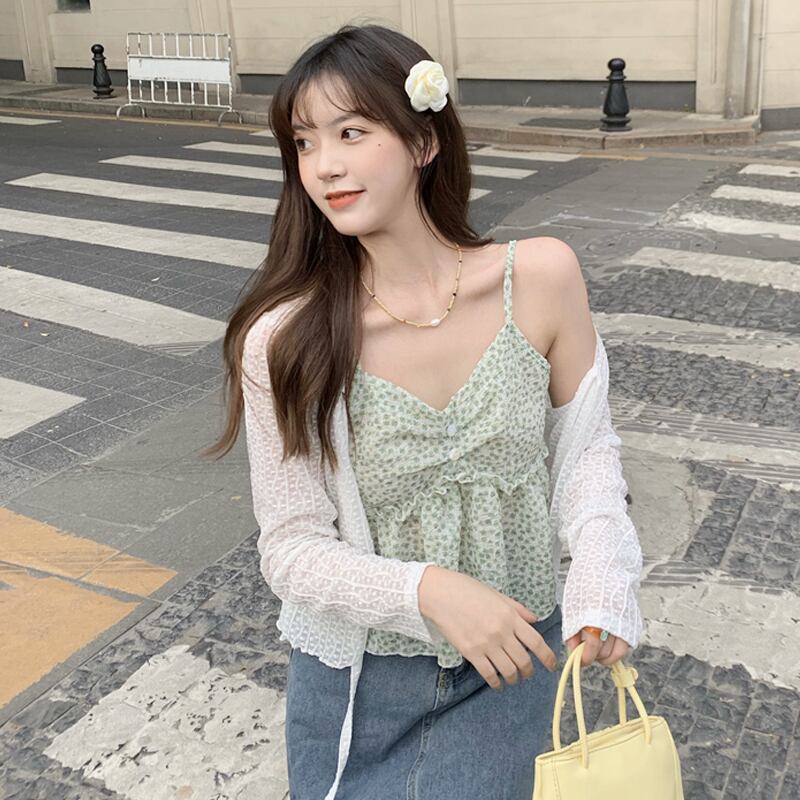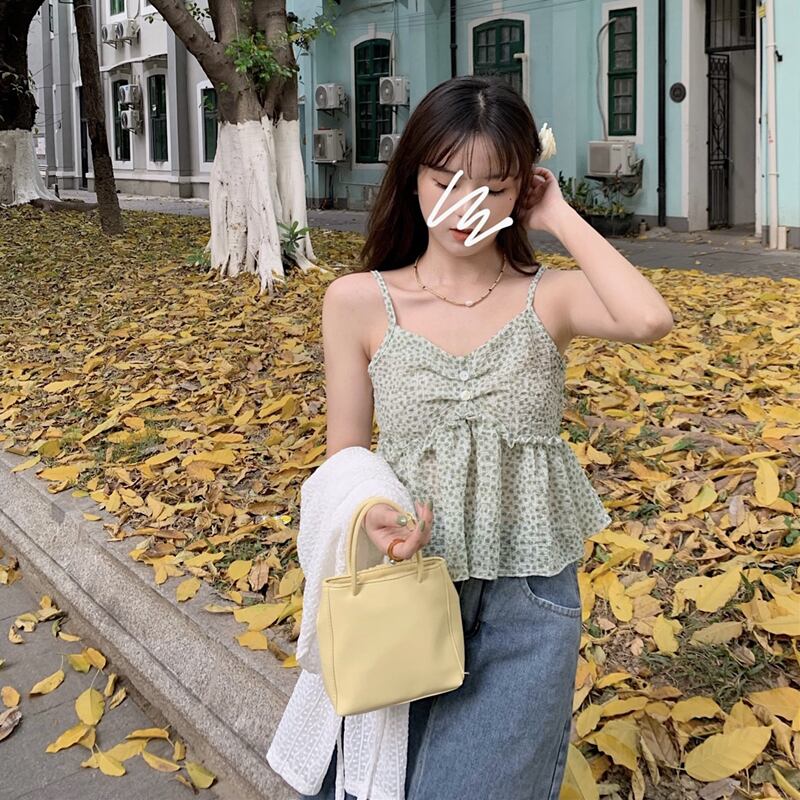 グリーンフローラル夏服ゆったりノースリーブショートトップス 夏物 花柄 SYJ40258953021