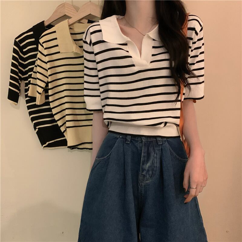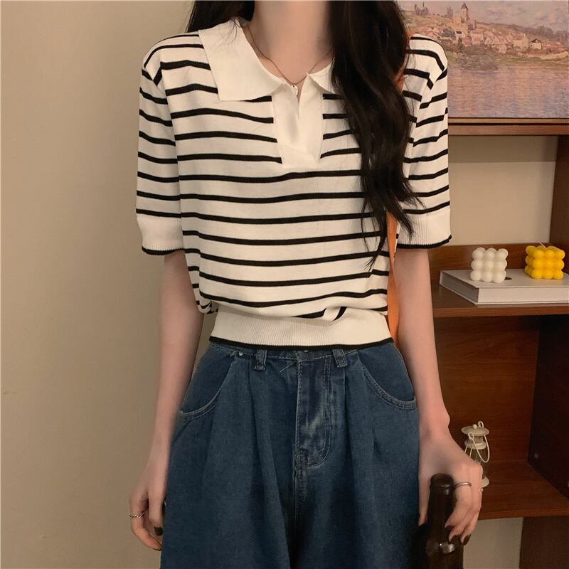 ホワイトストライプカラーニットセーター 夏服トップス 夏物 SYJ98545855788