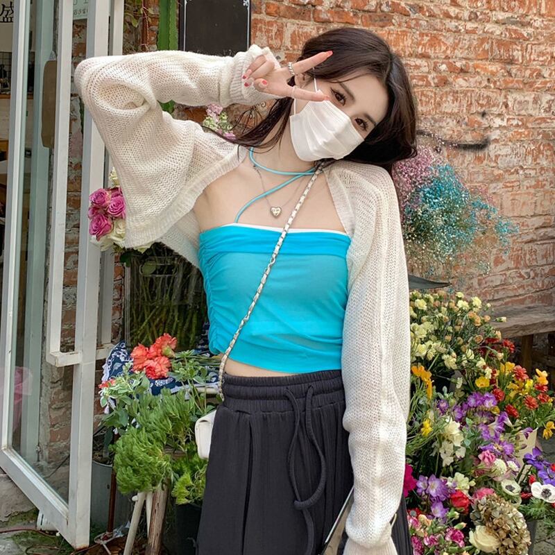 カーディガン夏服薄手ショールブラウス ホワイトセーター 韓国ファッションスタイルショートトップス 夏物 シルク SYJ845050296