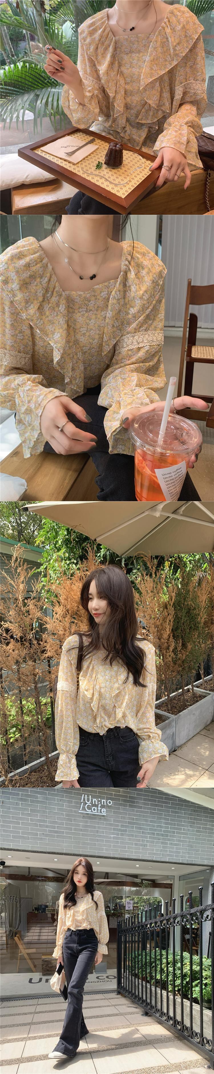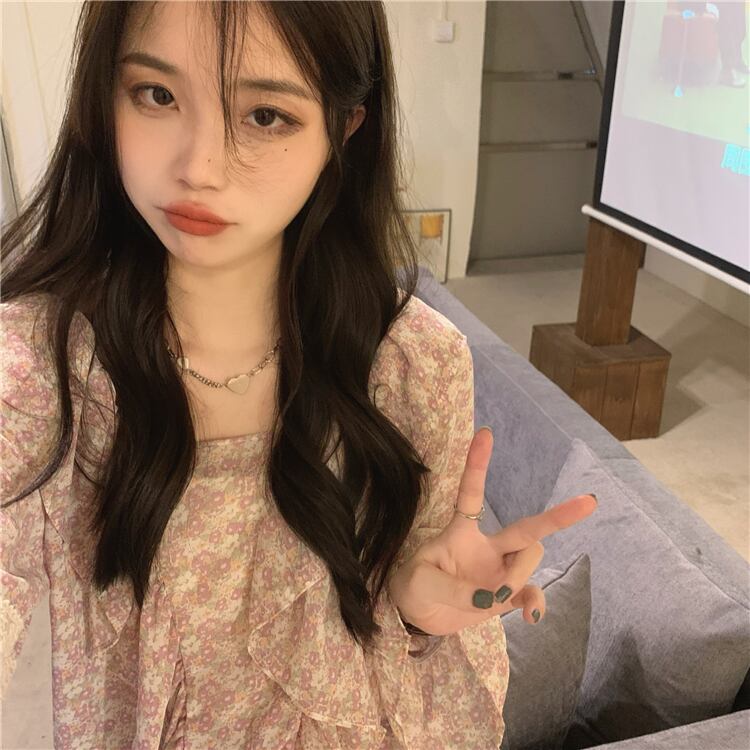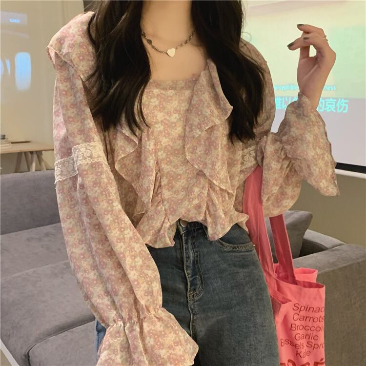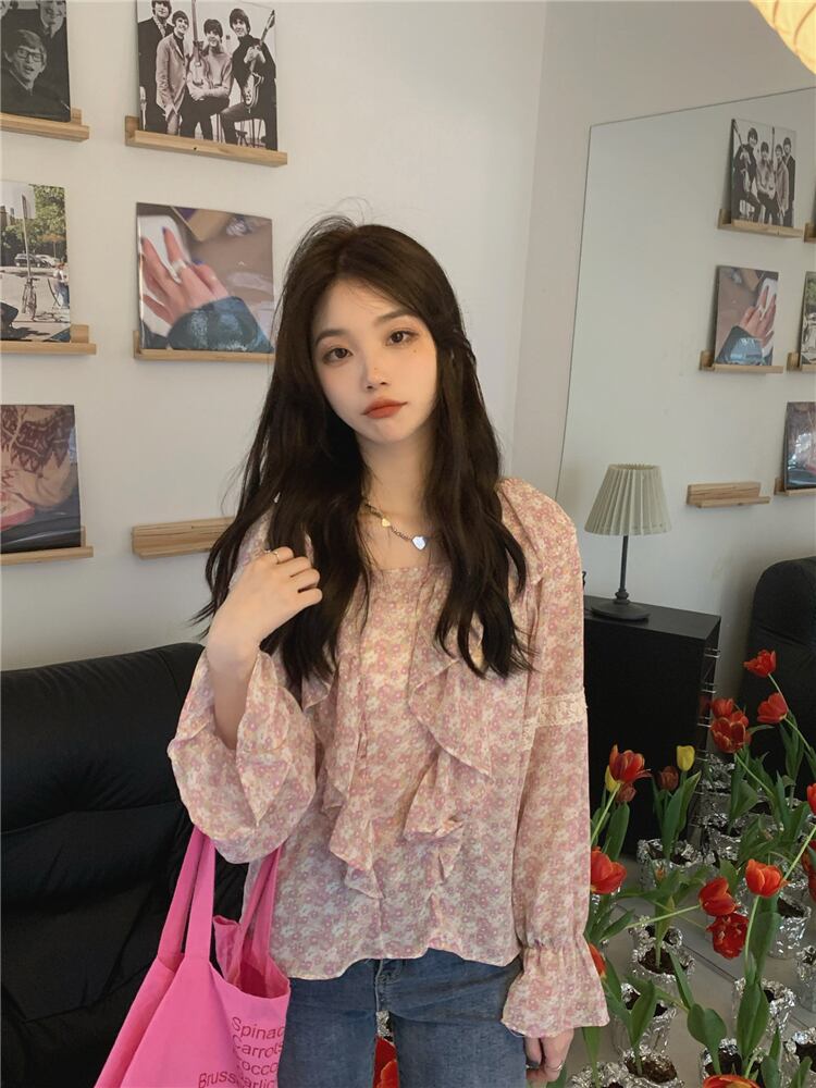 フローラルシフォンシャツ スプリングトップス ロング 大人ガーリー スウィート キュート カジュアル 春物 花柄 パープル 長袖 SYJ59430898710