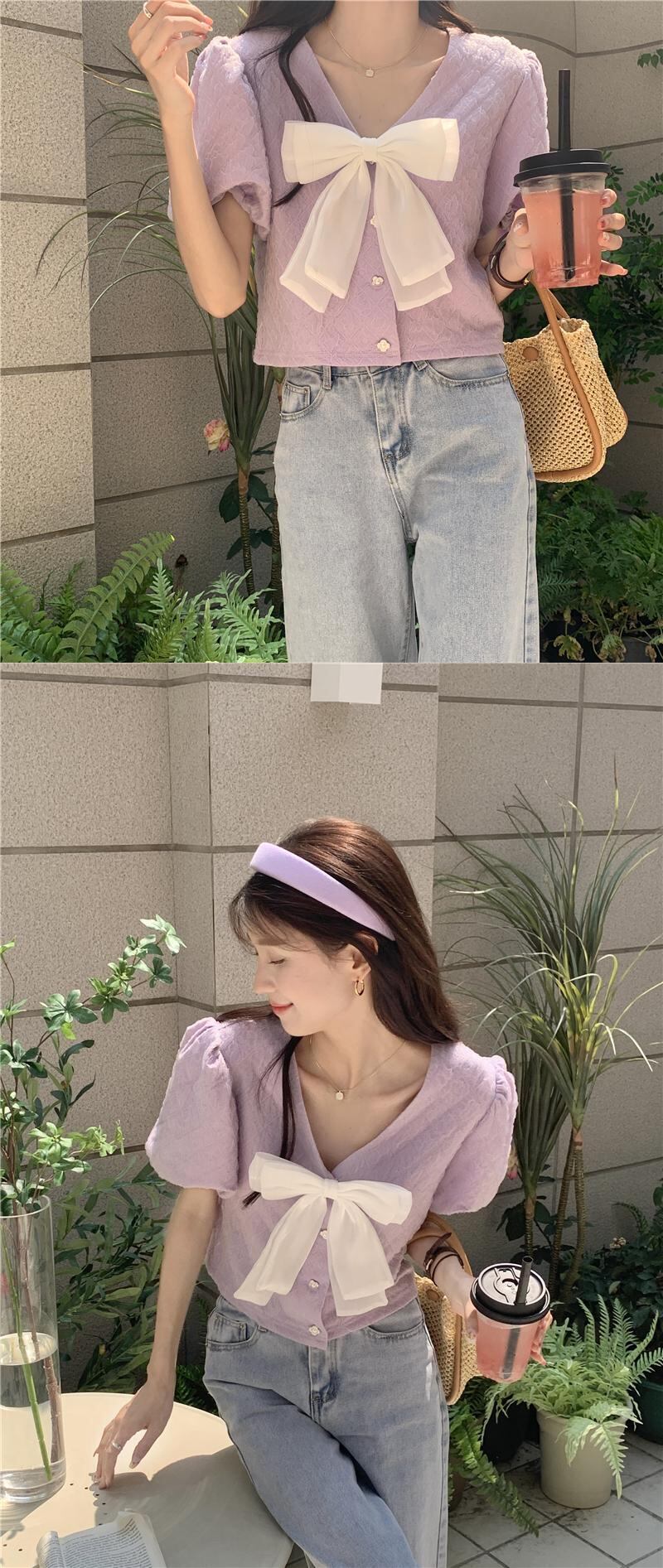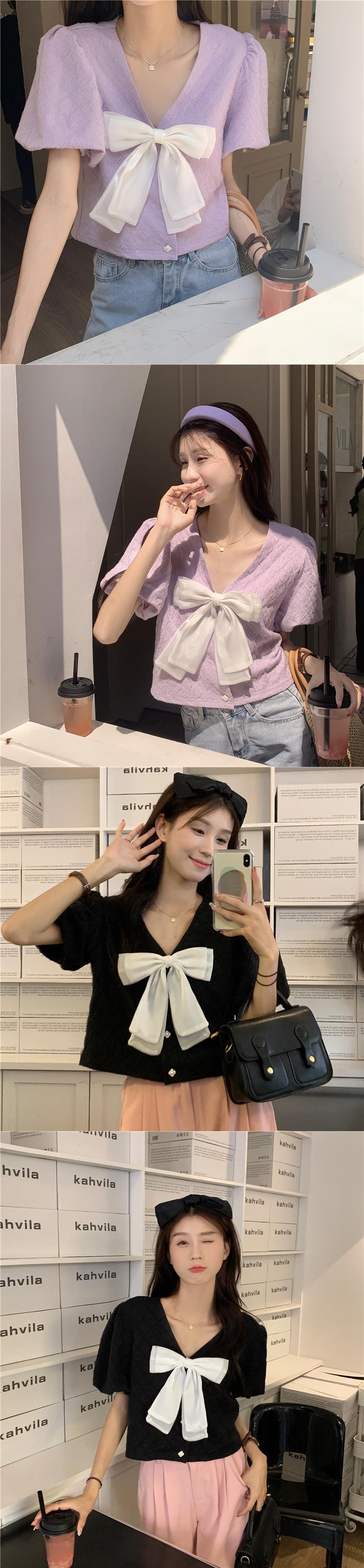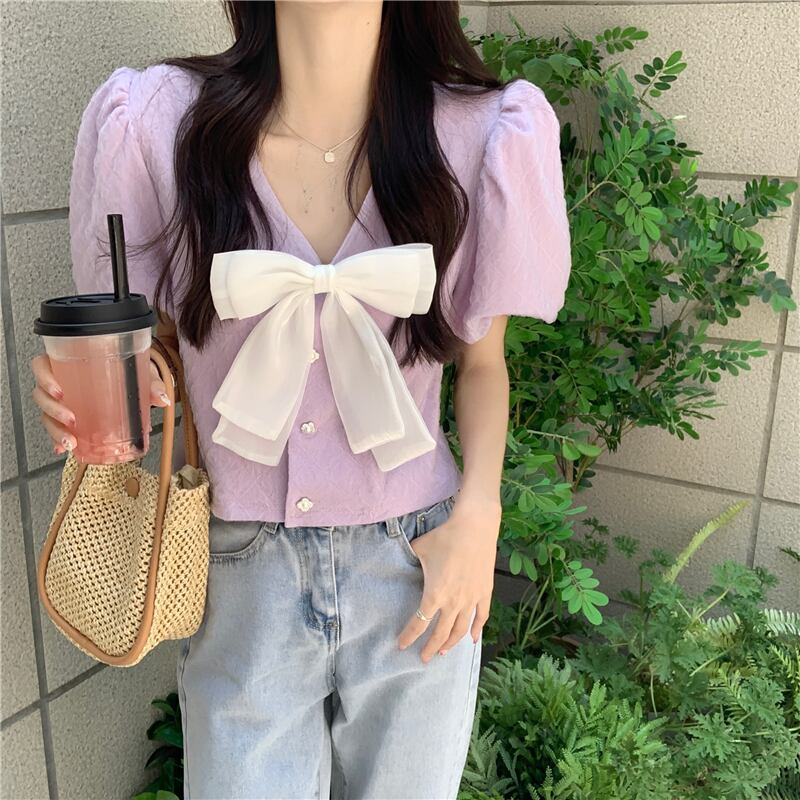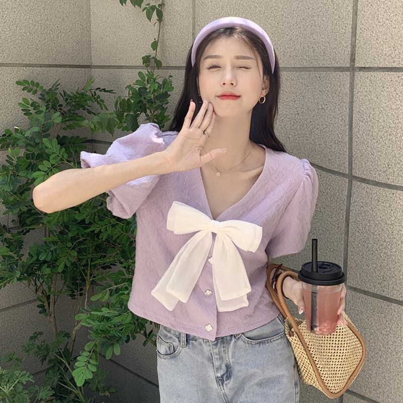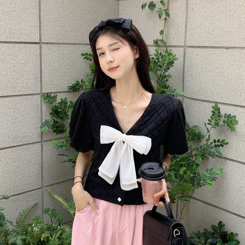 ショートトップス 夏服韓国ファッションVネックスリーブシャツ 大人ガーリー スウィート キュート カジュアル 夏物 SYJ40346903161