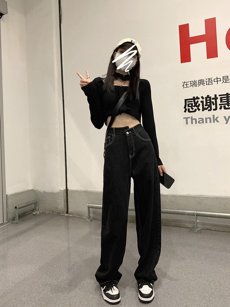 ブラックジーンズ スプリングルーズパンツ ハイウェストウェスト薄手 春物 ウエスト SYJ99044777279