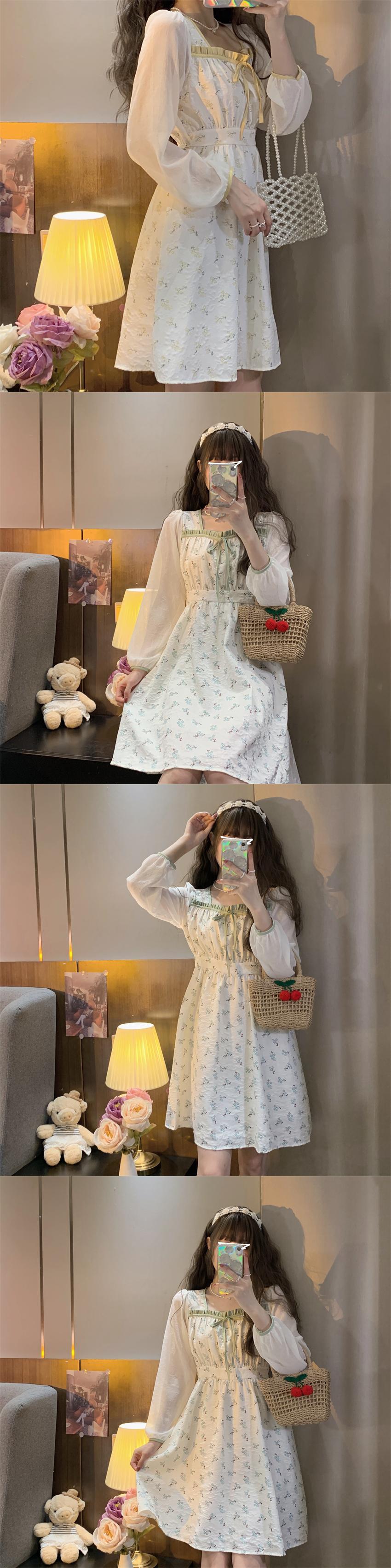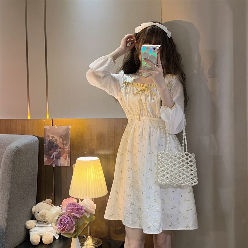 イエローフローラルワンピースレディーススプリング秋物スカート ロング 大人ガーリー スウィート キュート カジュアル 春物 オータム 花柄 長袖 SYJ58378601423