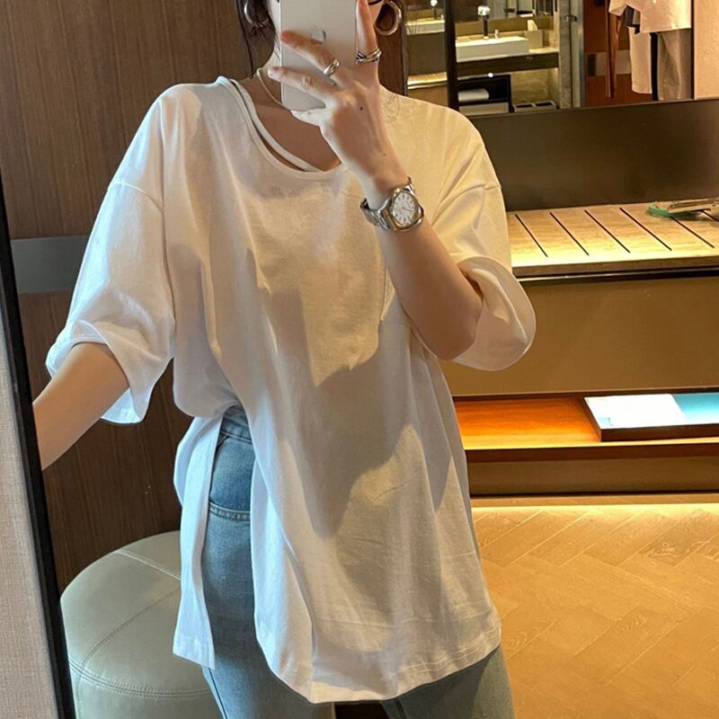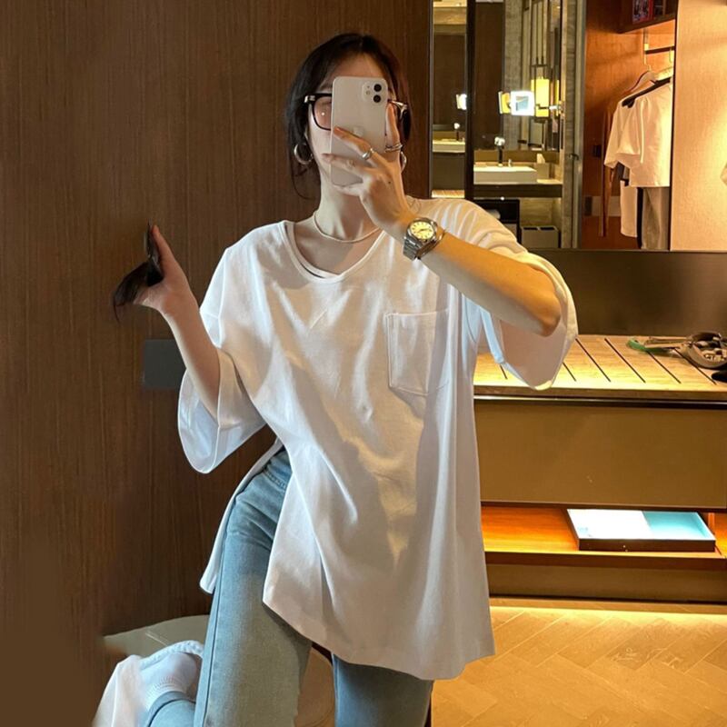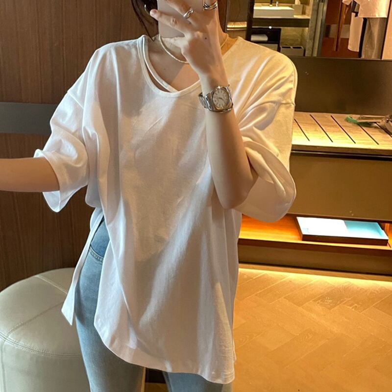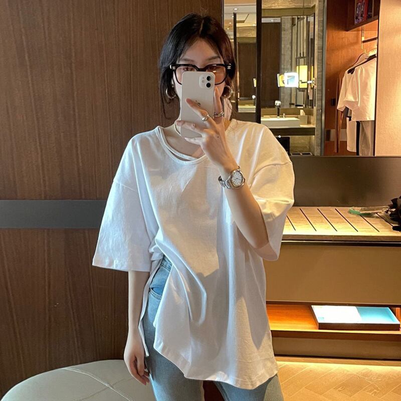 ホワイトTシャツ夏服ルーズトップス レッド 夏物 ミドル丈 SYJ72031970351