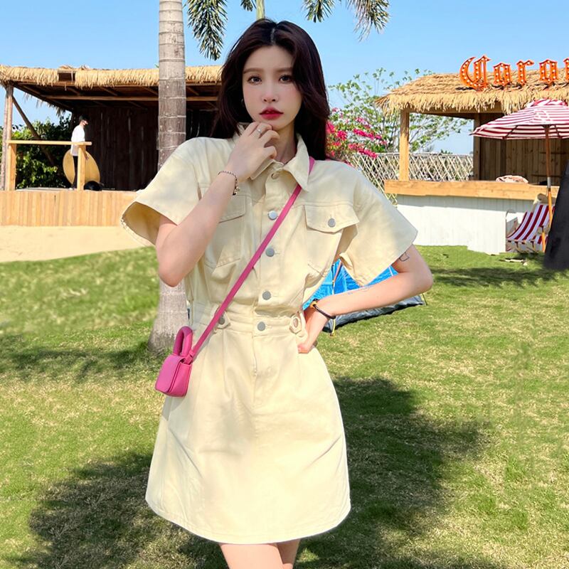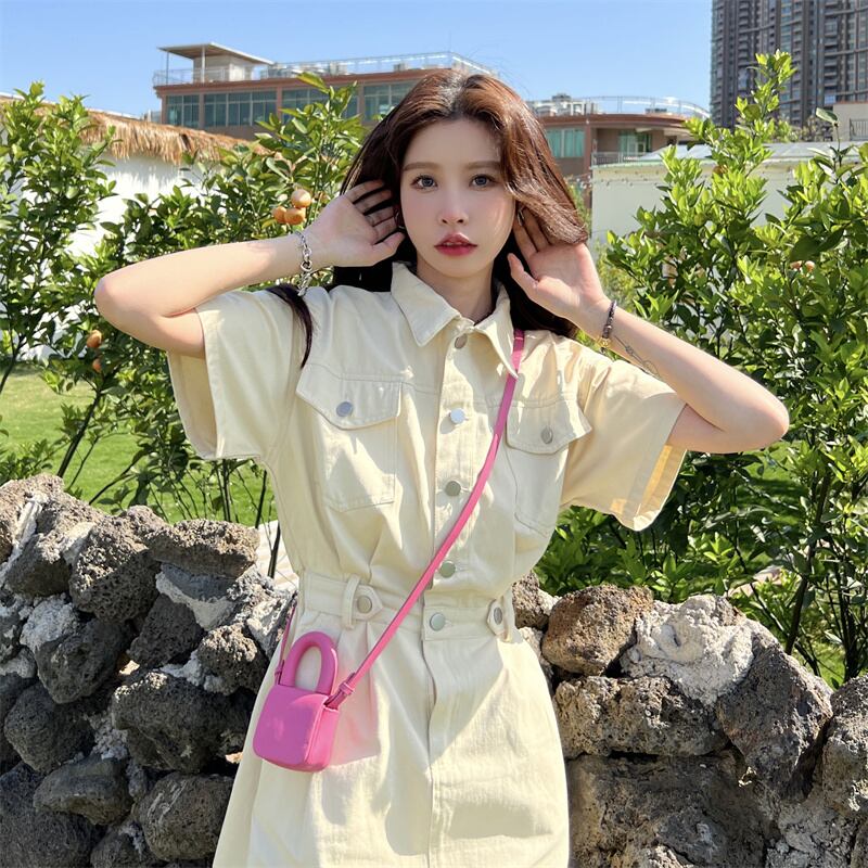 ワンピース夏服韓国ファッションウェストショートスカート ピンク 夏物 ウエスト SYJ97738144803
