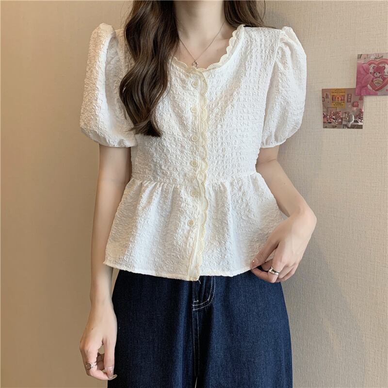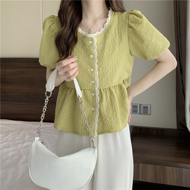 韓国ファッショントップス レディース夏服ブルースリーブシャツ 大人ガーリー スウィート キュート カジュアル 夏物 SYJ70400414049