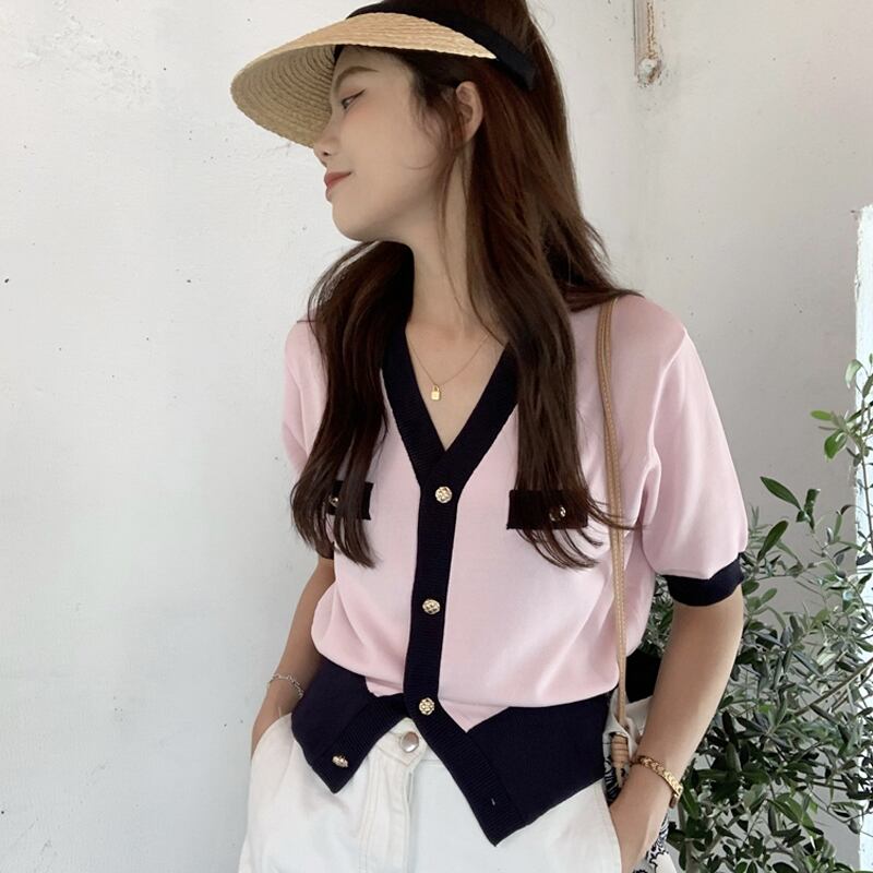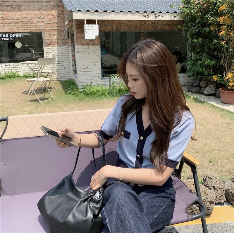 ブルーショートニットカーディガン夏服トップス 夏物 SYJ26382309086