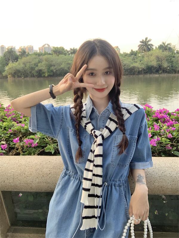 色:ダークブルーのシングルピース,ライトブルーのワンピース,ストライプショールワンピース
