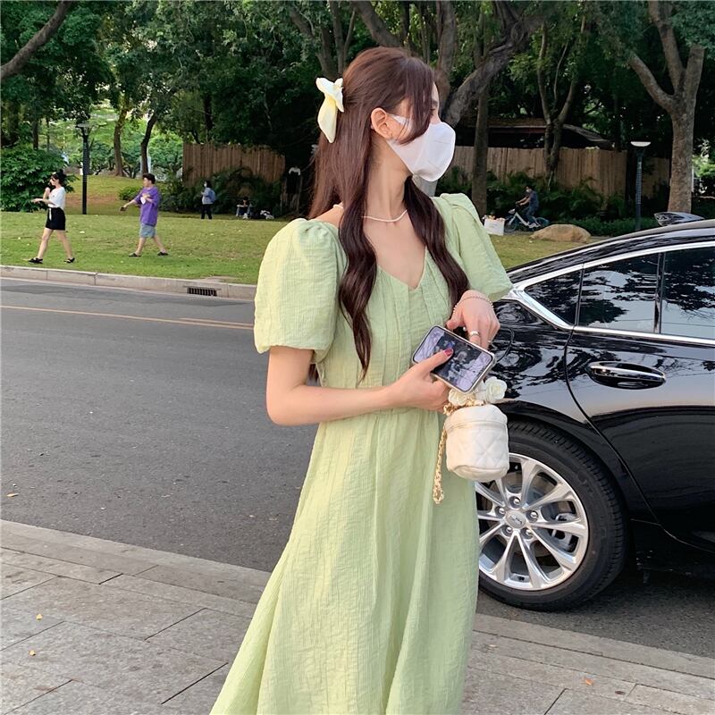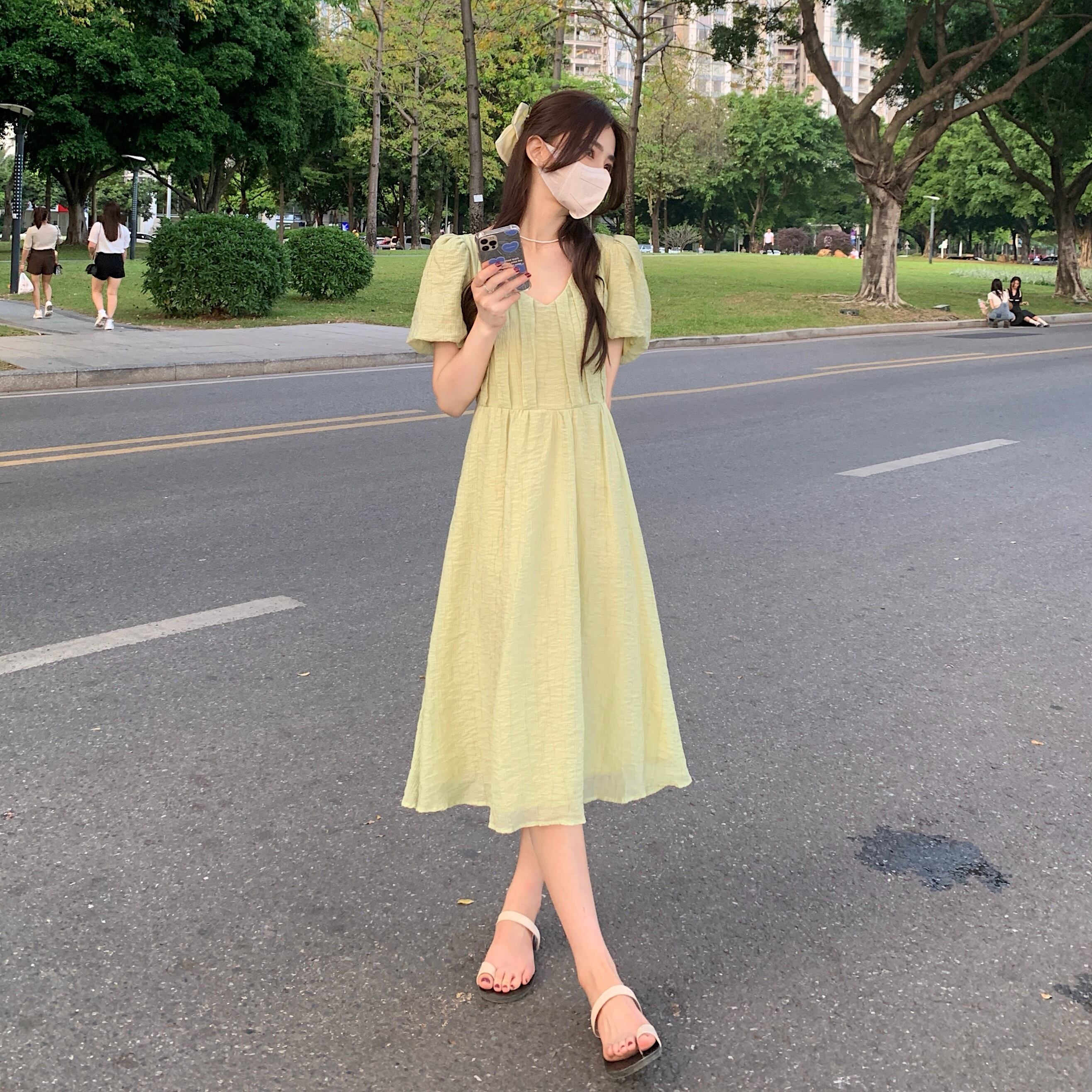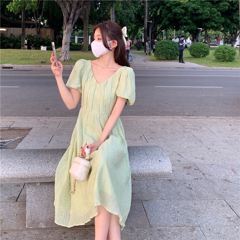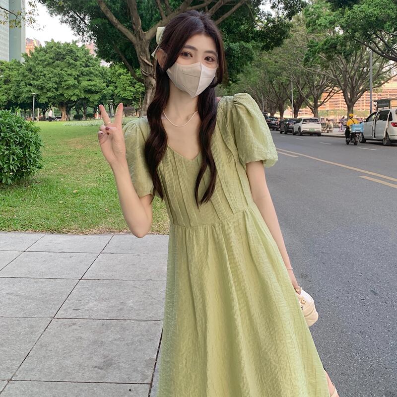 グリーンVネックスリーブワンピース夏服ロングスカート 夏物 SYJ77858188611