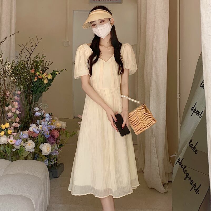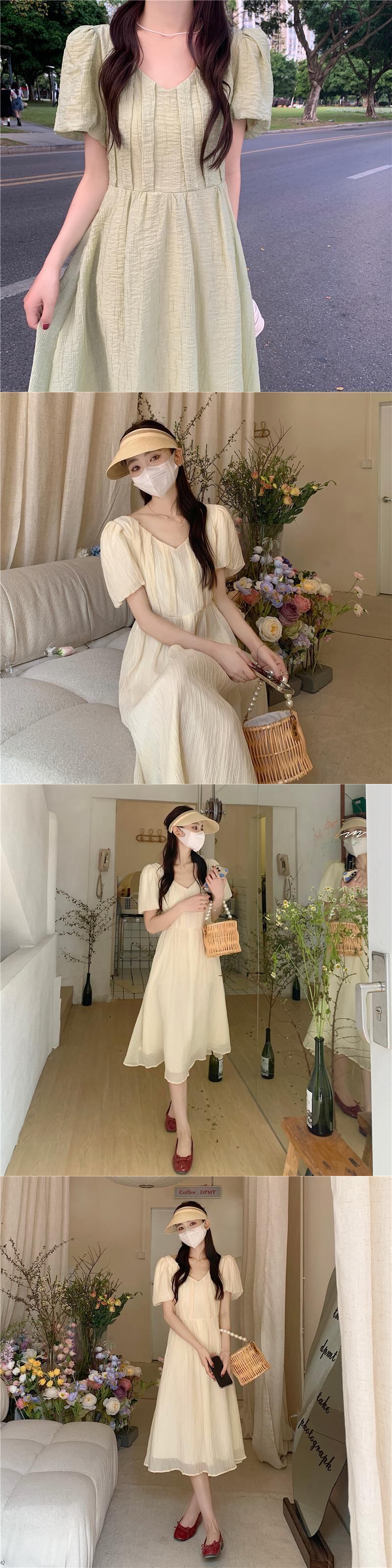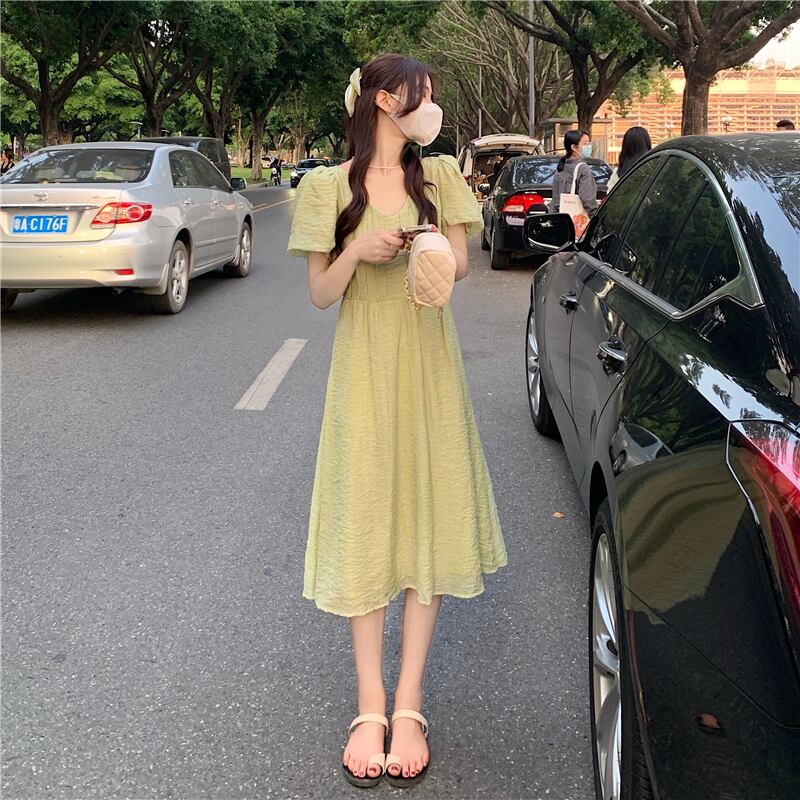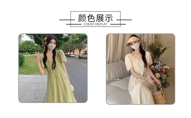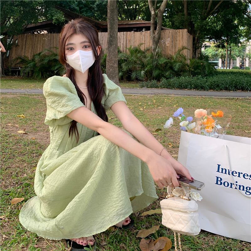 グリーンVネックスリーブワンピース夏服ロングスカート 夏物 SYJ77858188611