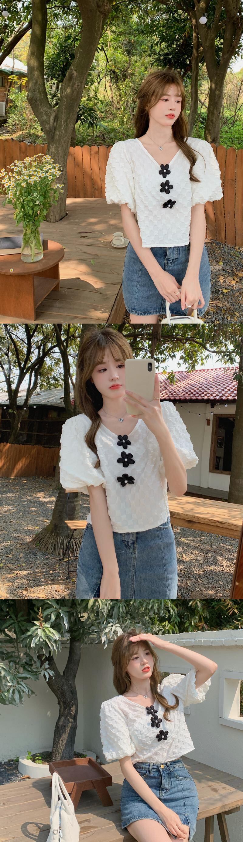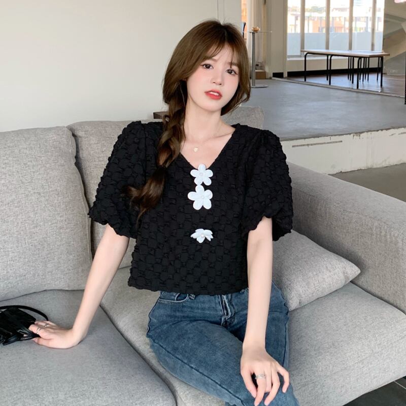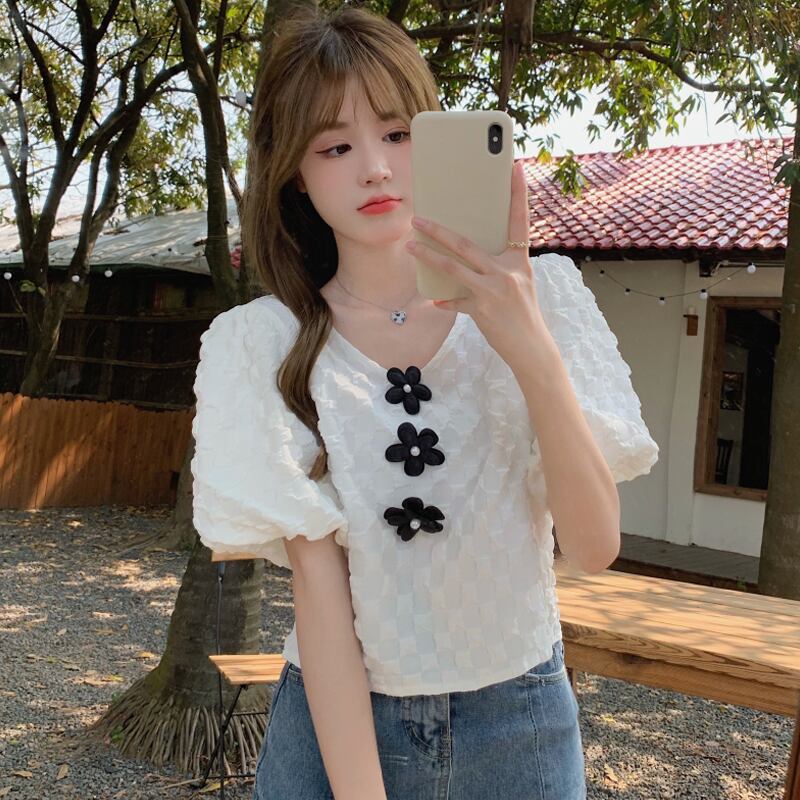 ブルースリーブシャツ 夏服ショートトップス 大人ガーリー スウィート キュート カジュアル 夏物 SYJ46589193811