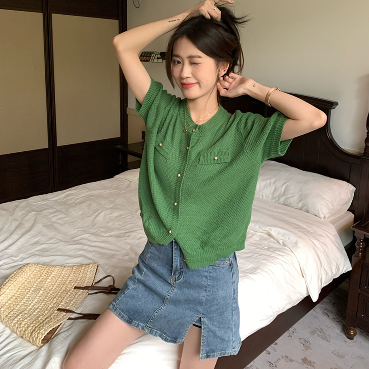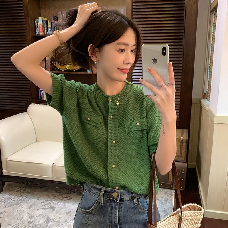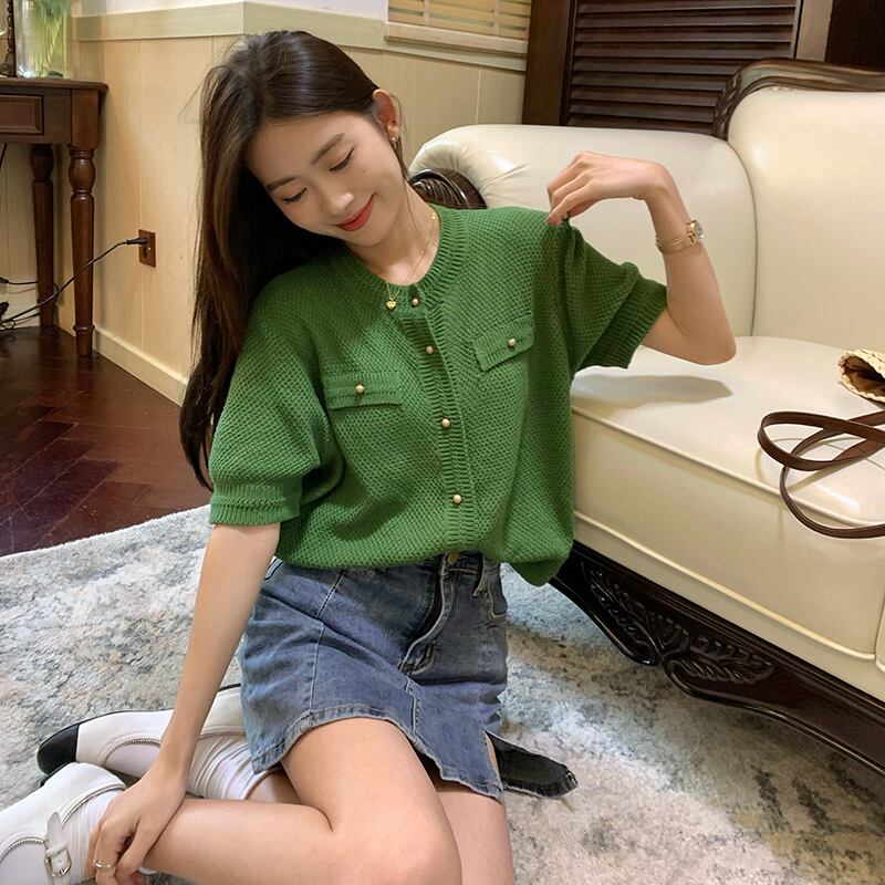 グリーンショートニットセーター 夏服スタンダードトップス レトロ 夏物 SYJ83966938347