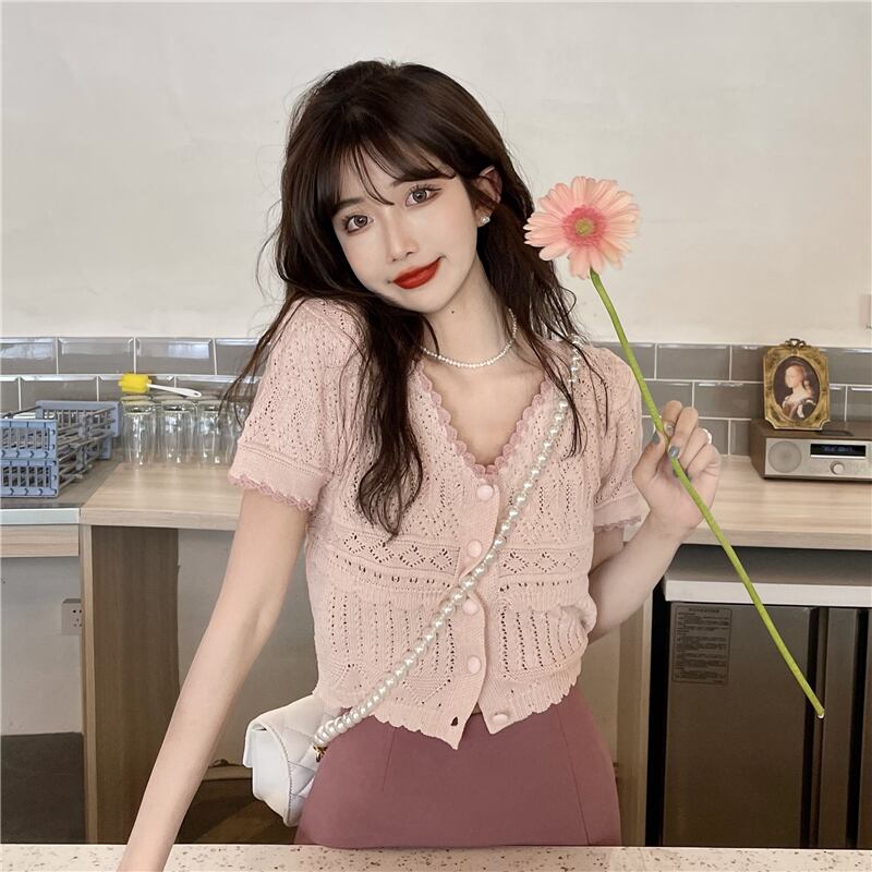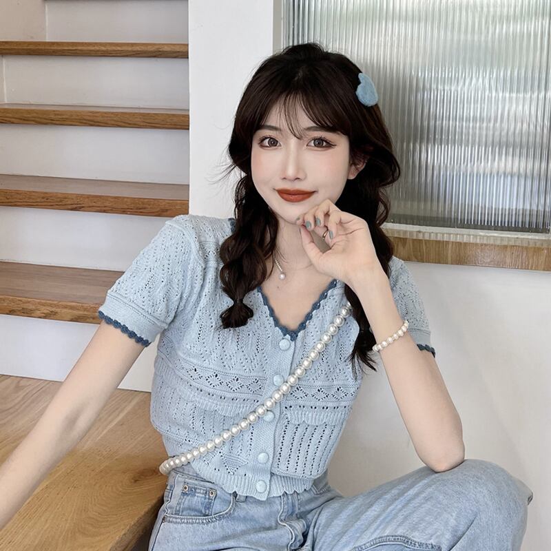 ブルーショートニットカーディガン夏服スタイルトップス 夏物 SYJ59576324082