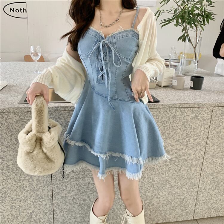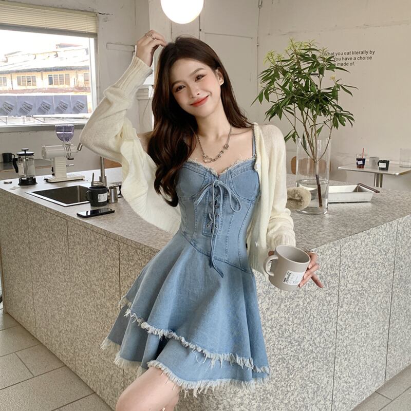 色:ホワイトカーディガンワンピース,ブルーデニムスカートのワンピース