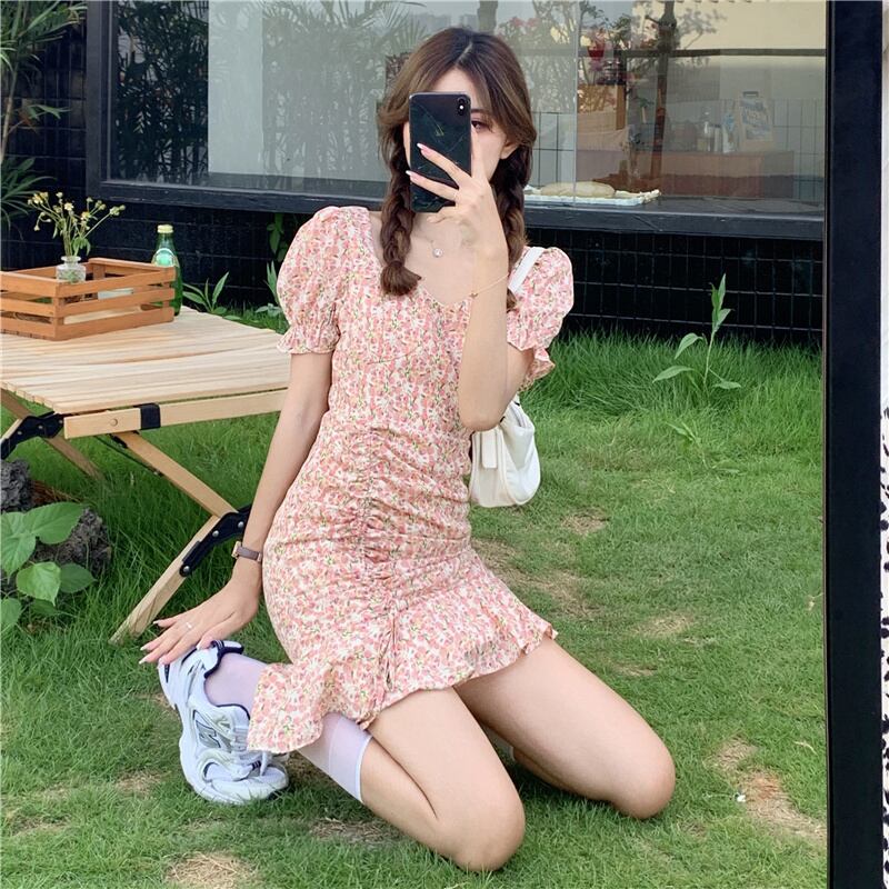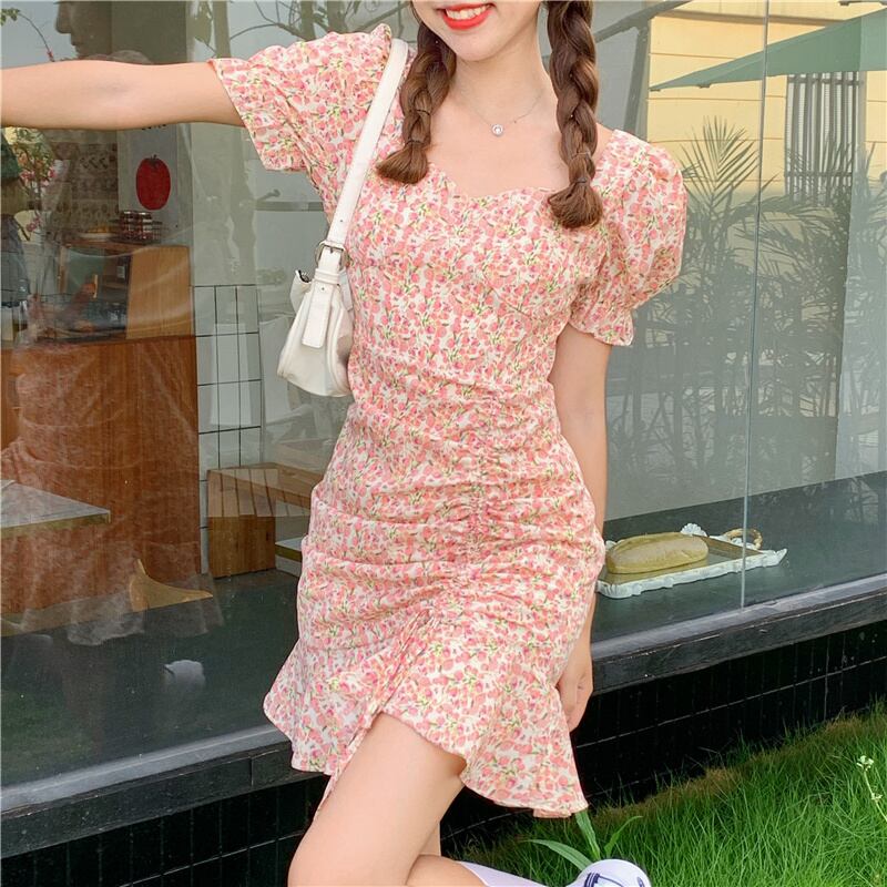 スリーブフローラルワンピース夏服ショートスカート 大人ガーリー スウィート キュート カジュアル 夏物 花柄 SYJ23407744817
