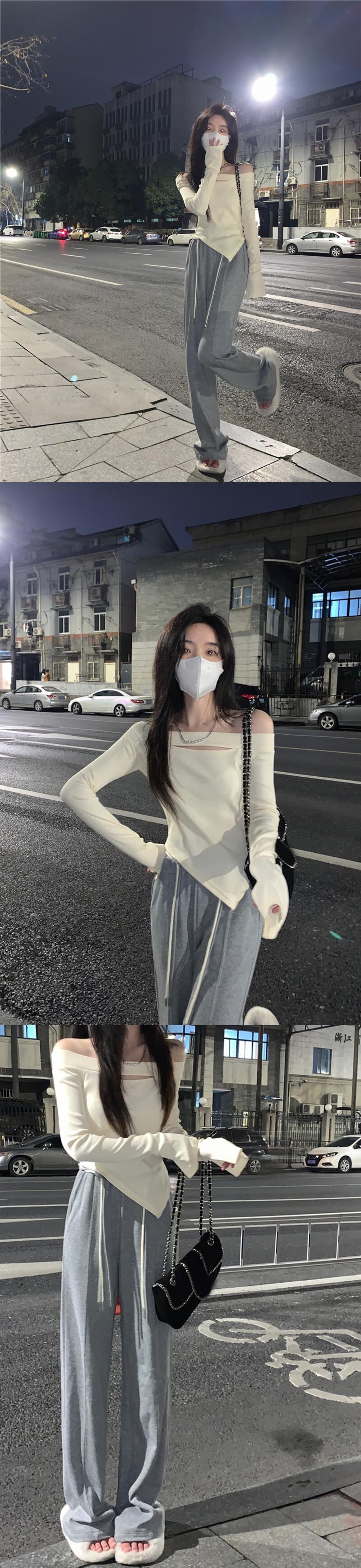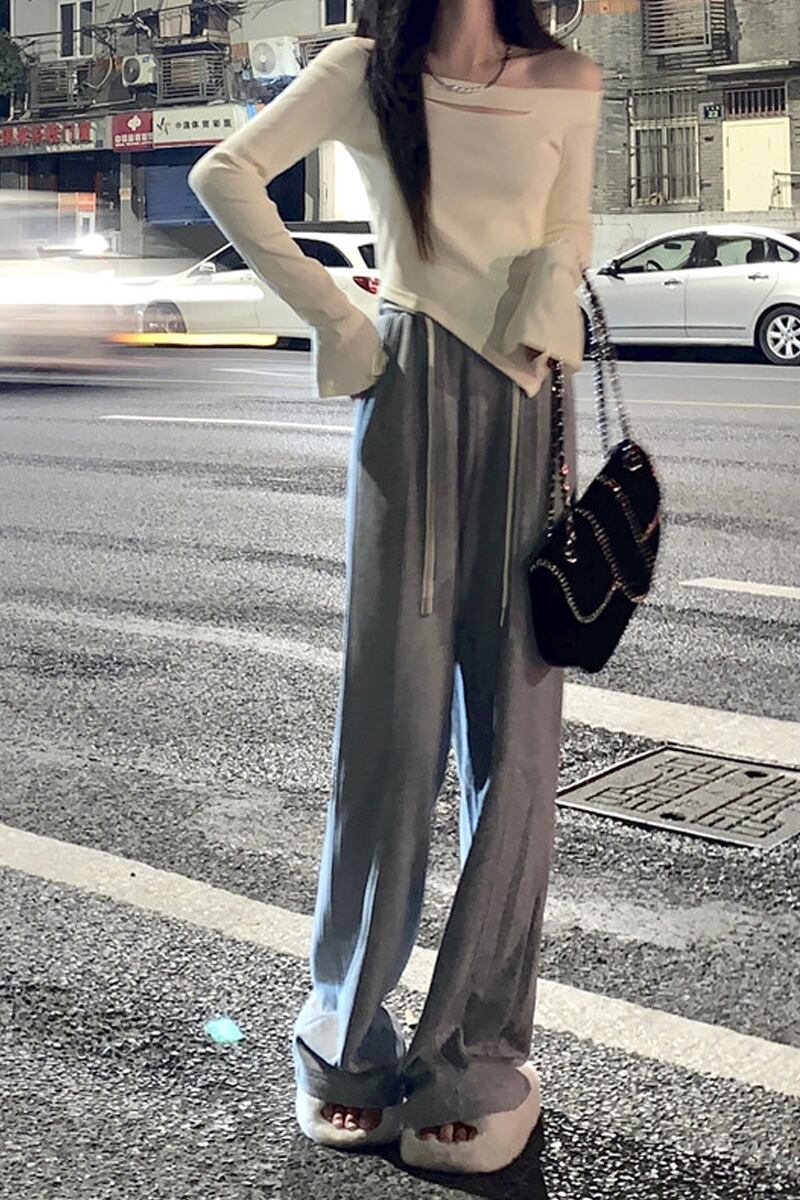色:クリームホワイトTシャツワンピース,灰色のズボン一枚