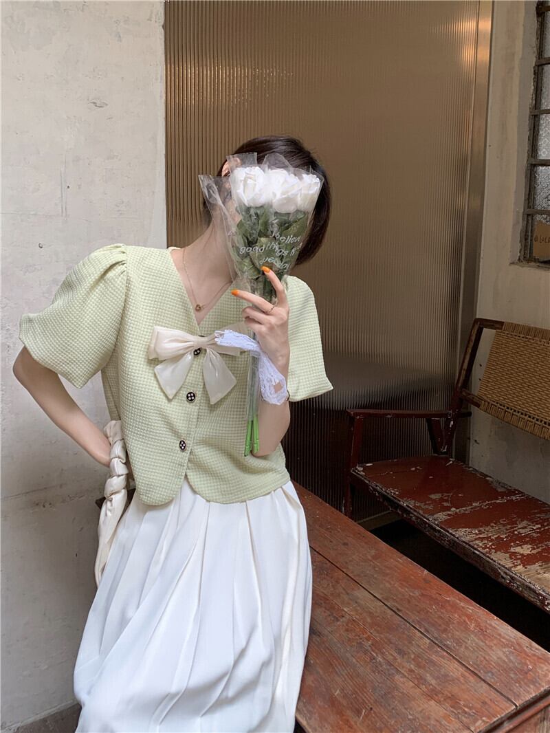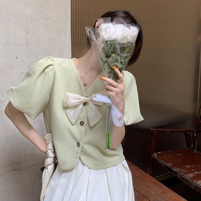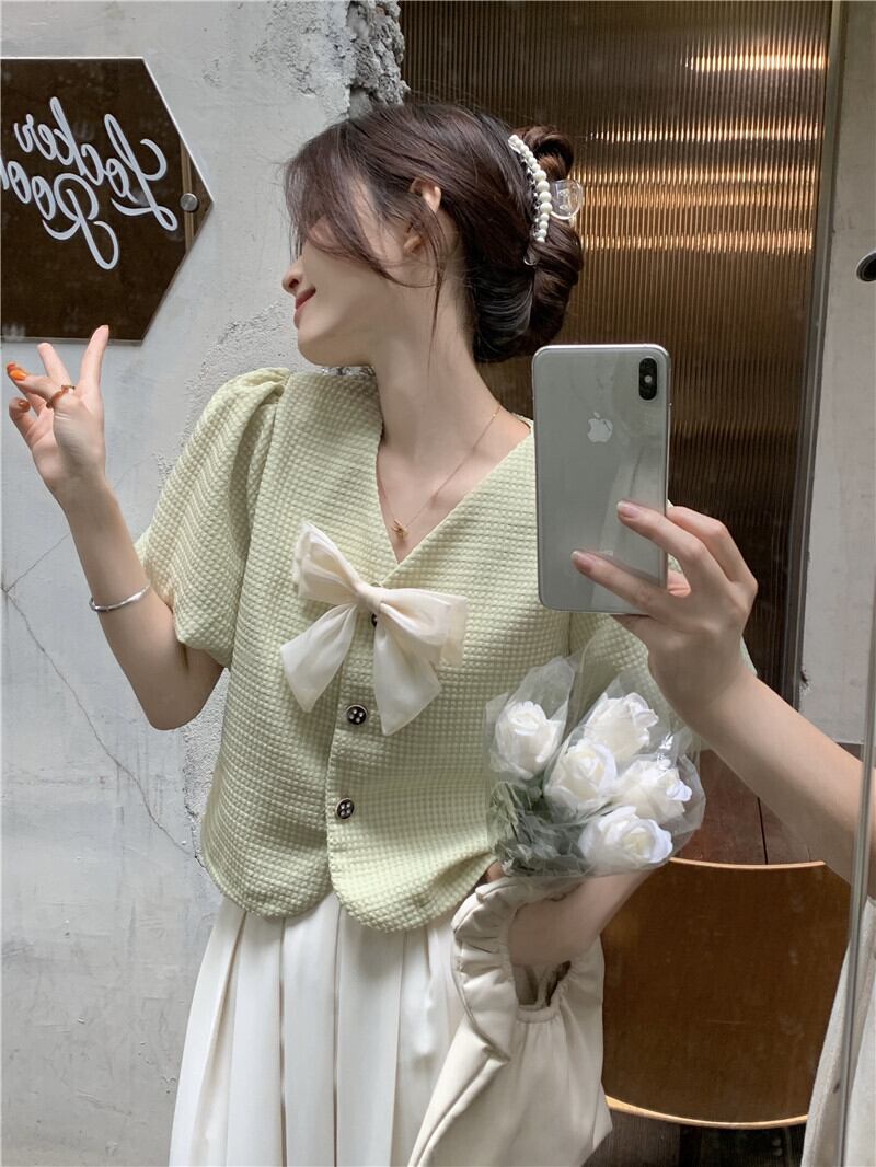 ショートトップス 夏服スリーブVネックグリーンシャツ 夏物 SYJ92113726136