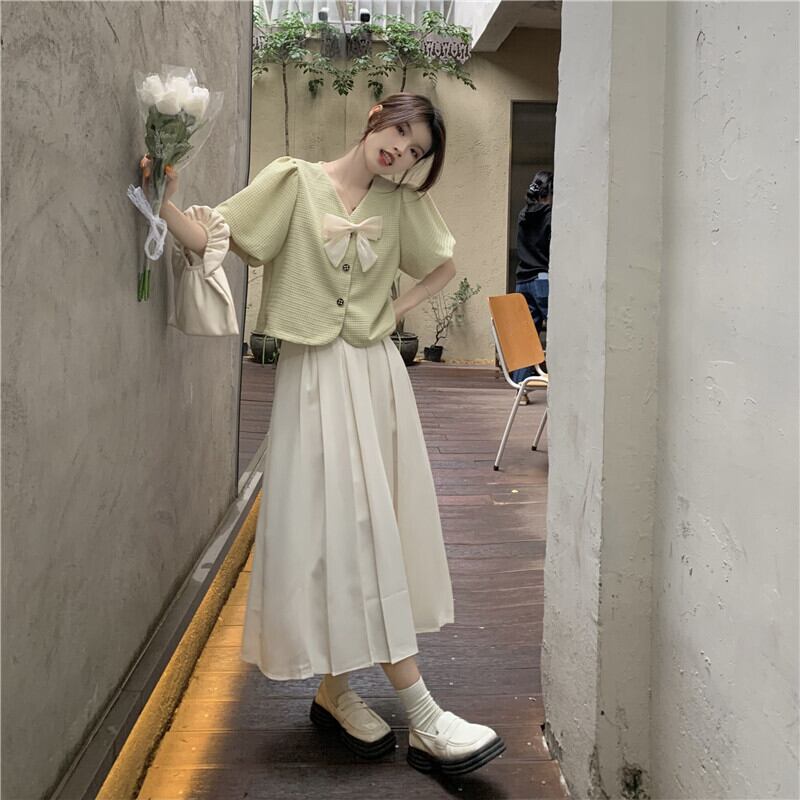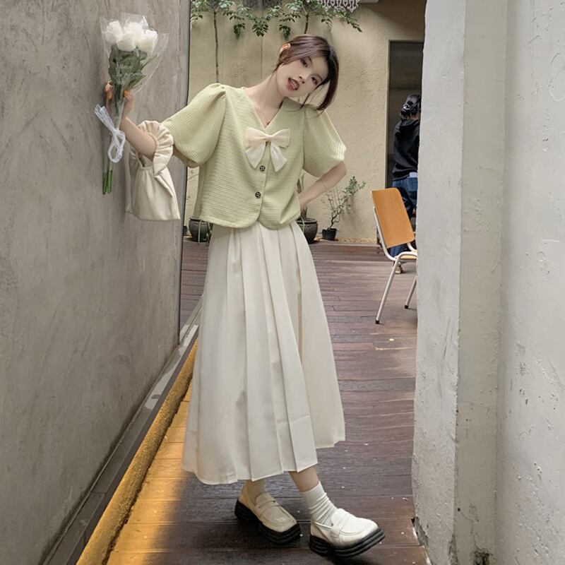 色:グリーントップシングルピース,ワンピースアプリコットスカート