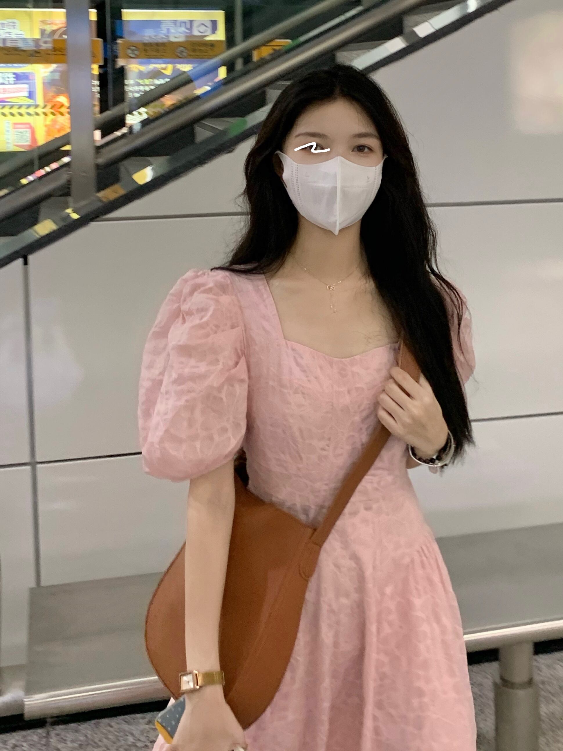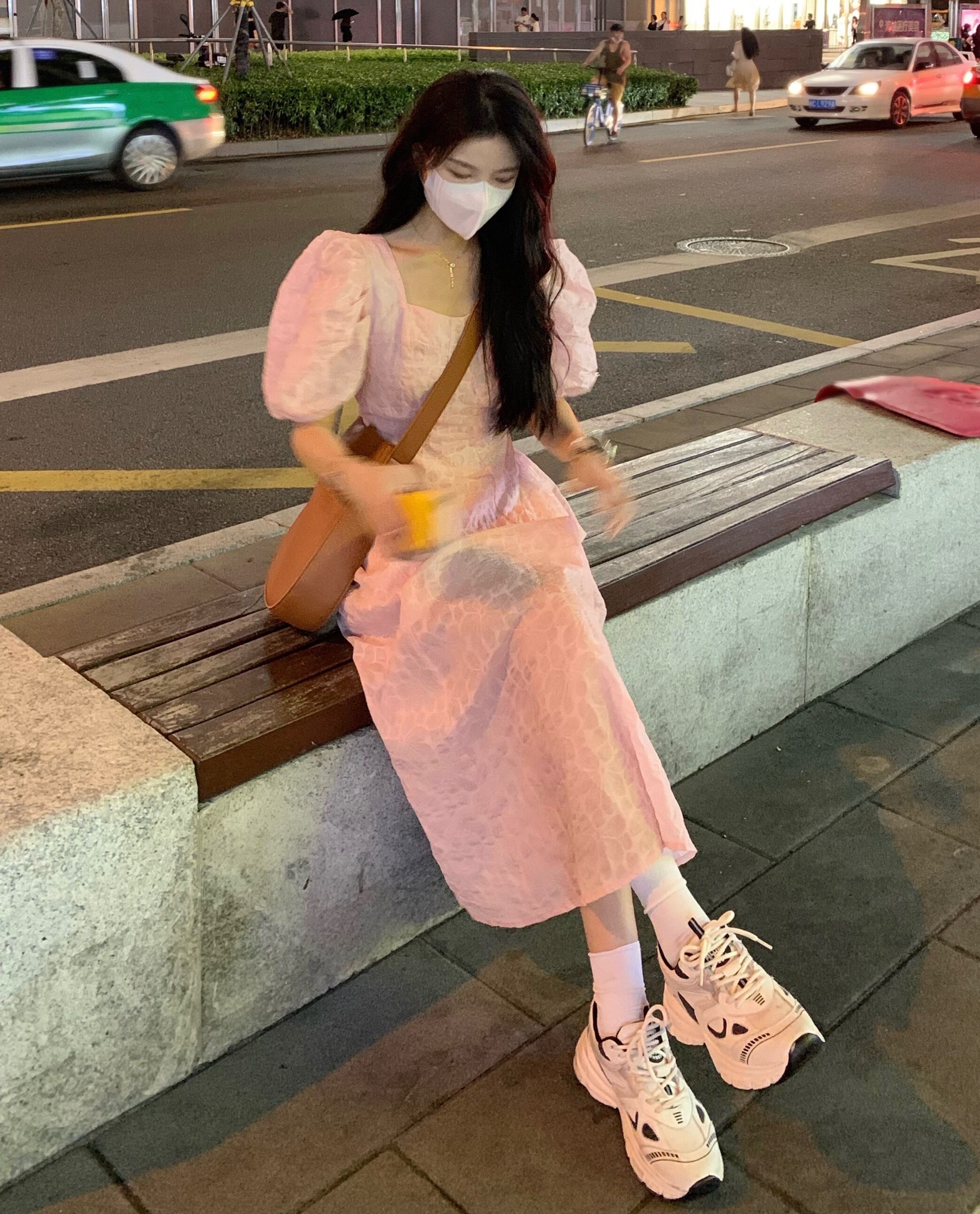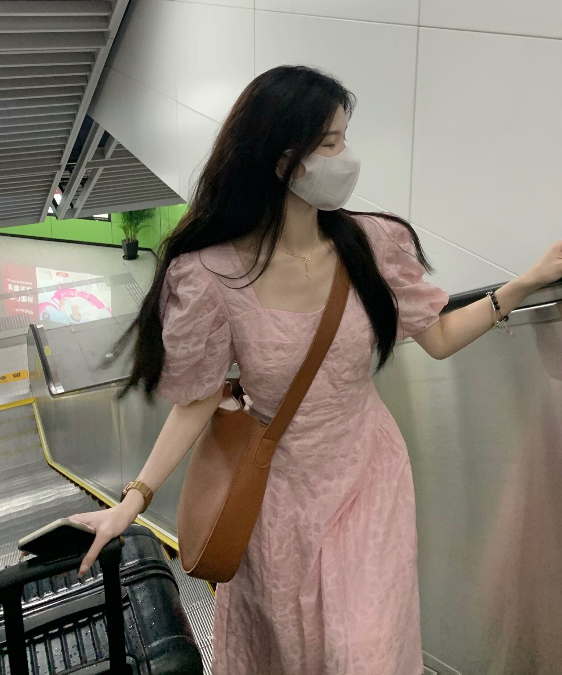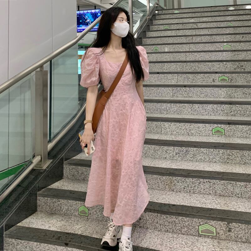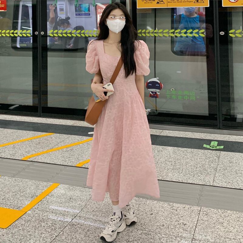 スリーブワンピース夏服ロングスカート ピンク 大人ガーリー スウィート キュート カジュアル 夏物 スクウェア SYJ50851450789