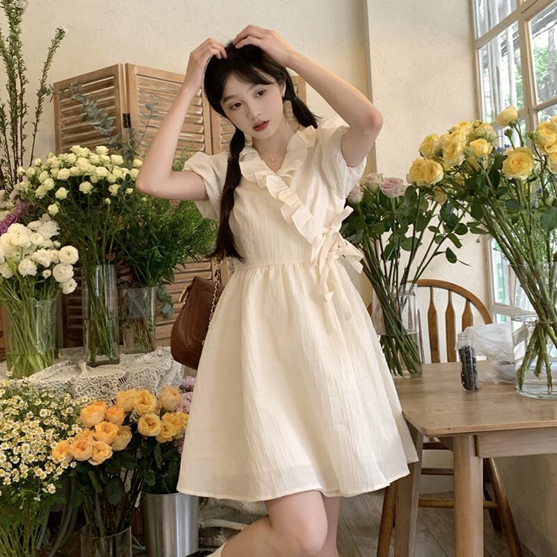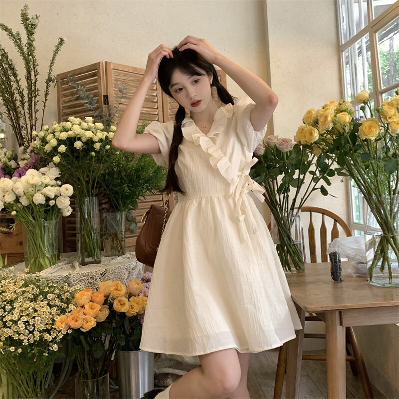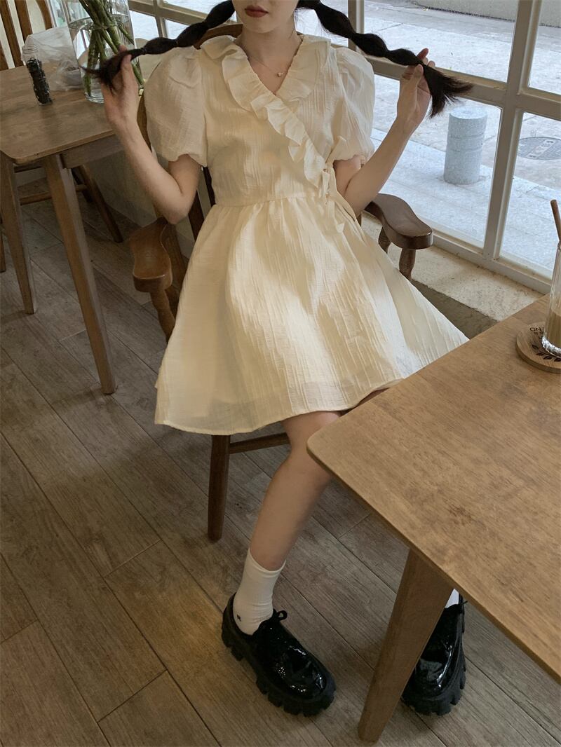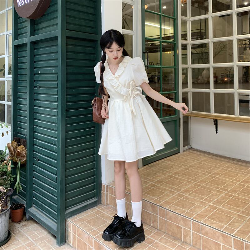 スリーブワンピース夏服ホワイトショートスカート 大人ガーリー スウィート キュート カジュアル 夏物 SYJ10906397537