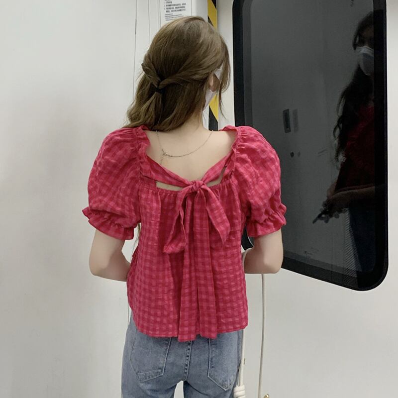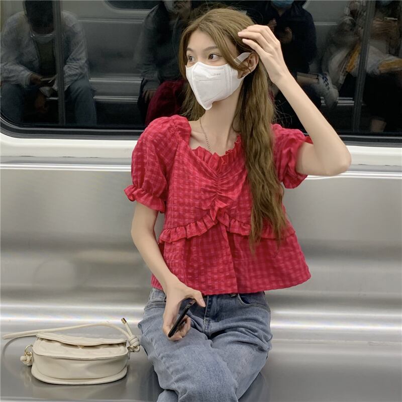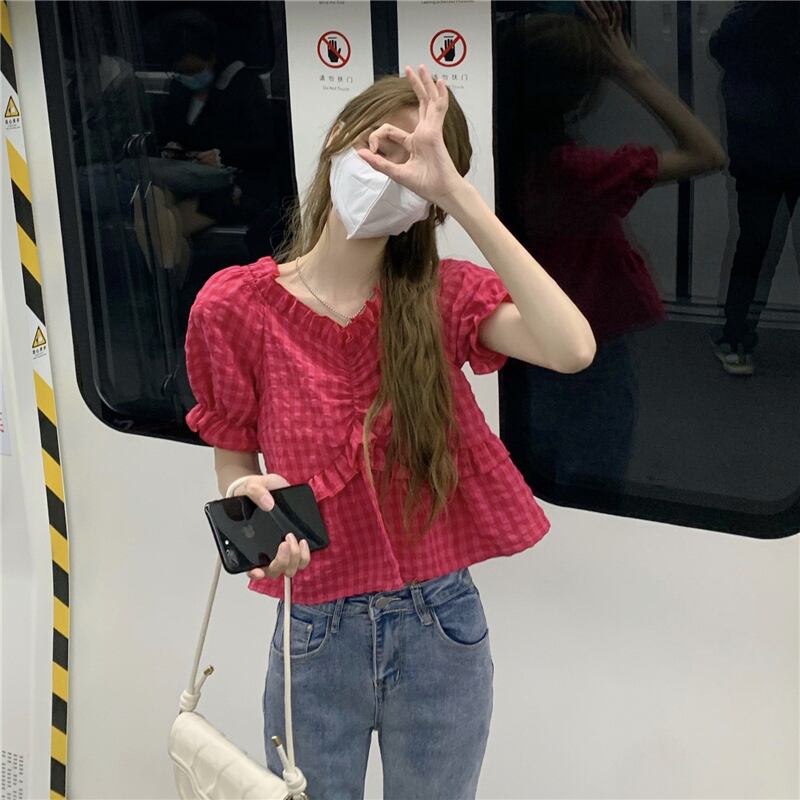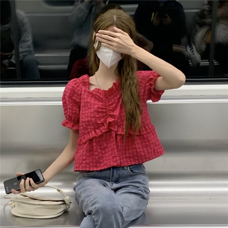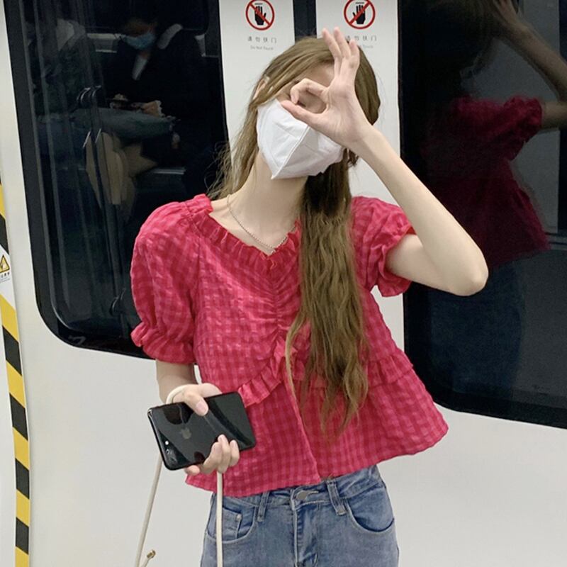 レッド格子柄ショートトップス 夏服韓国ファッションスタイルシャツ 大人ガーリー スウィート キュート カジュアル 夏物 SYJ80131654120