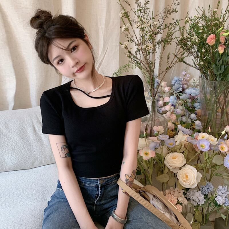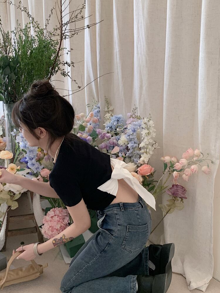ショートトップス 夏服バックリボンスリムブラックTシャツNEW 夏物 SYJ33212175068