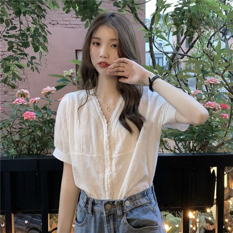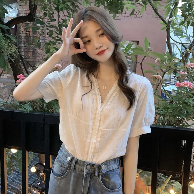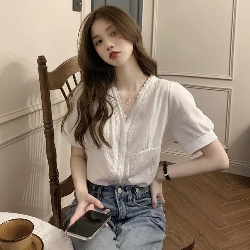 ホワイトVネックスリーブショートシャツ 夏服トップス 夏物 SYJ39274308677