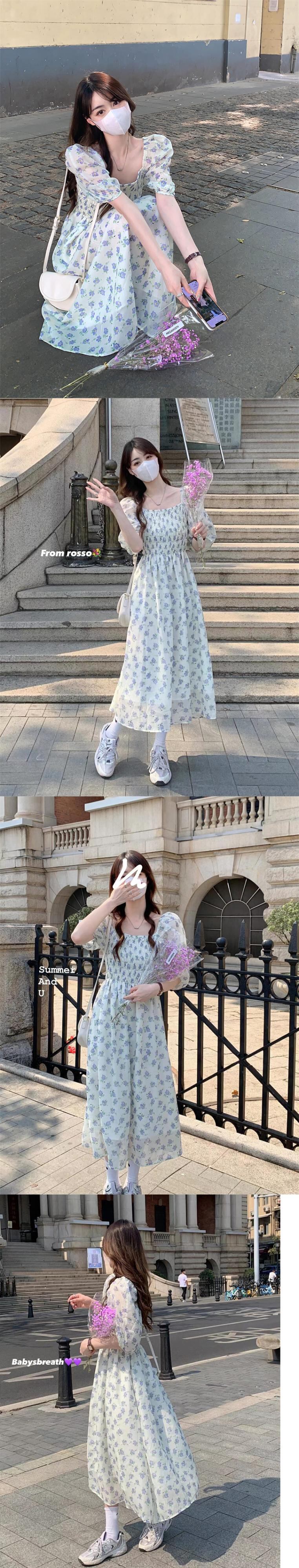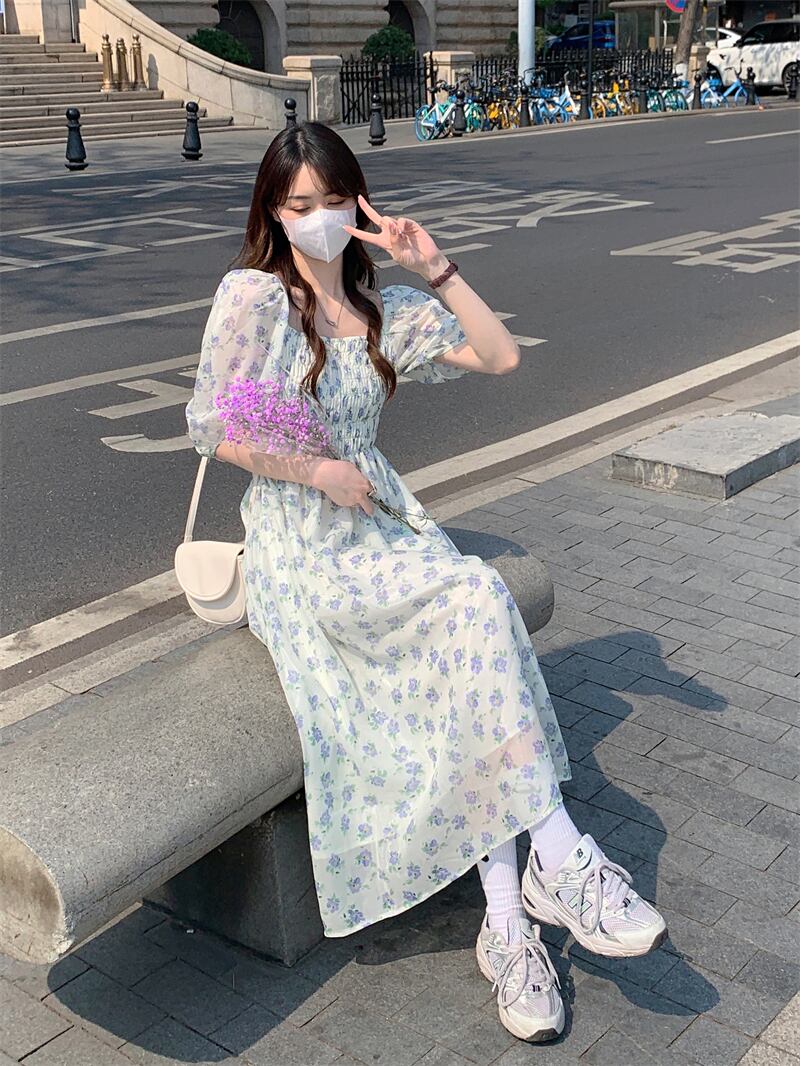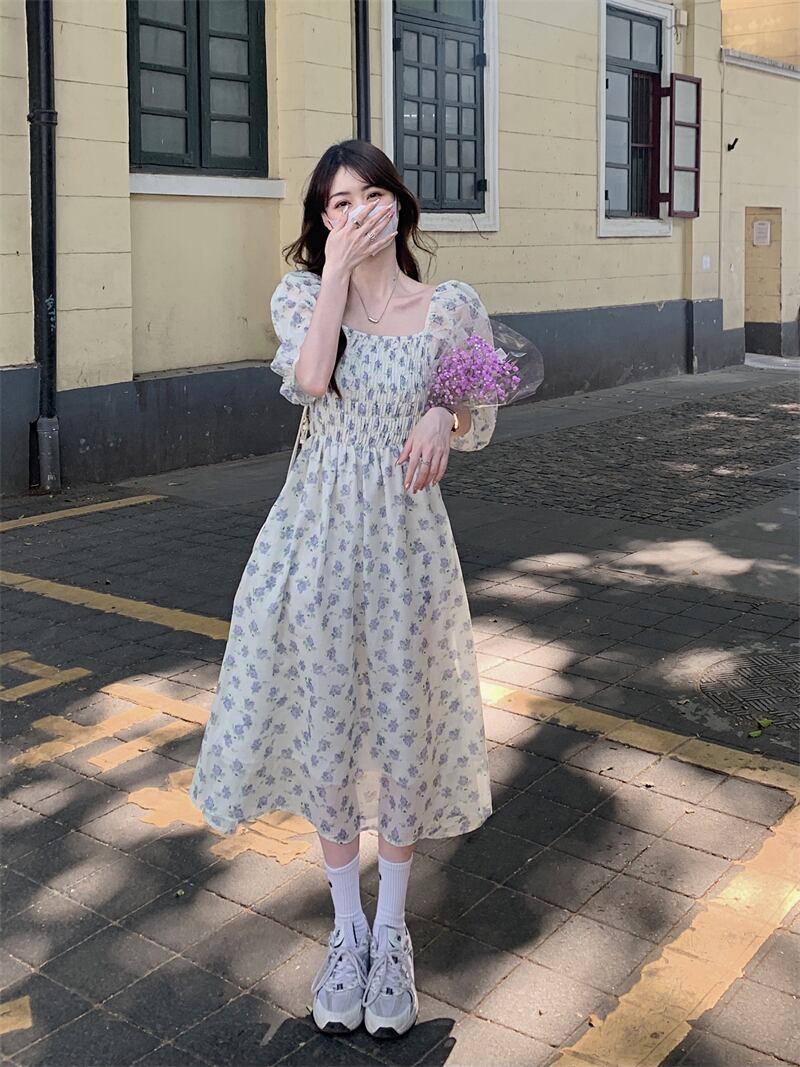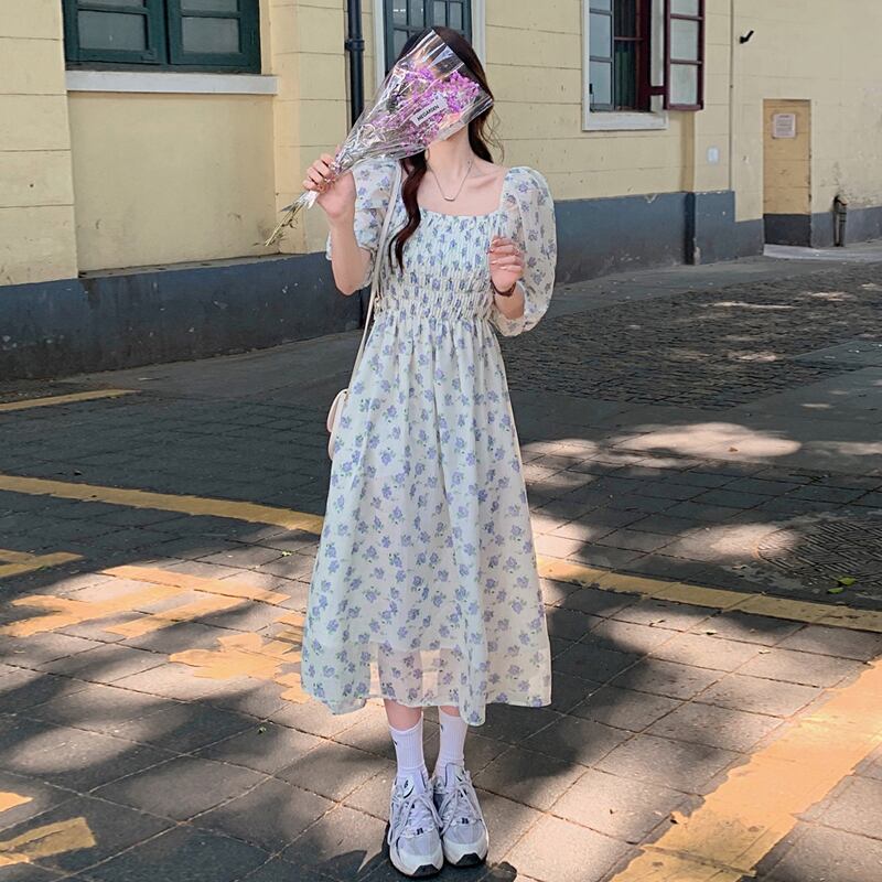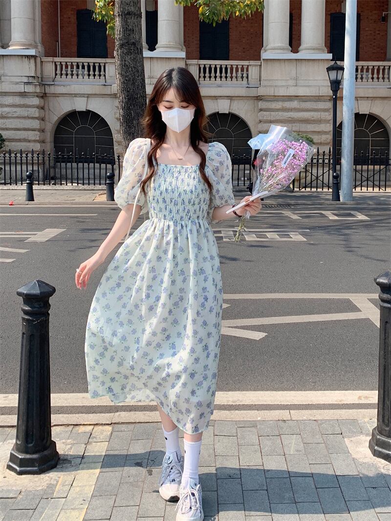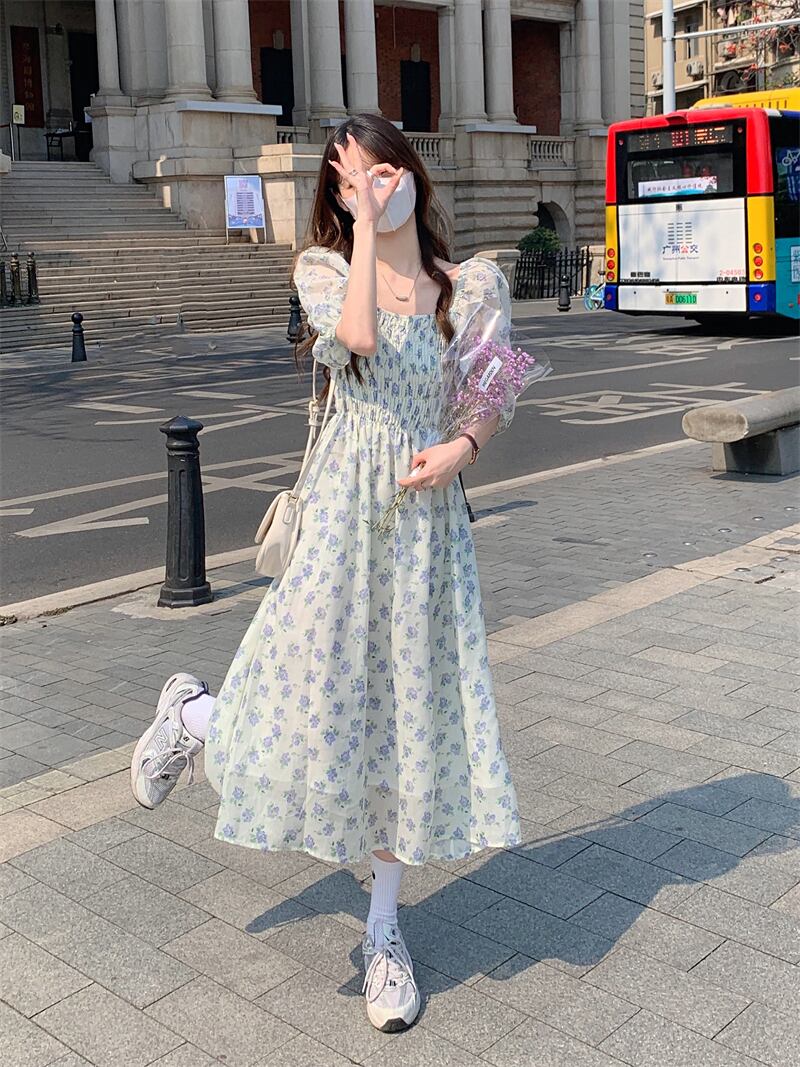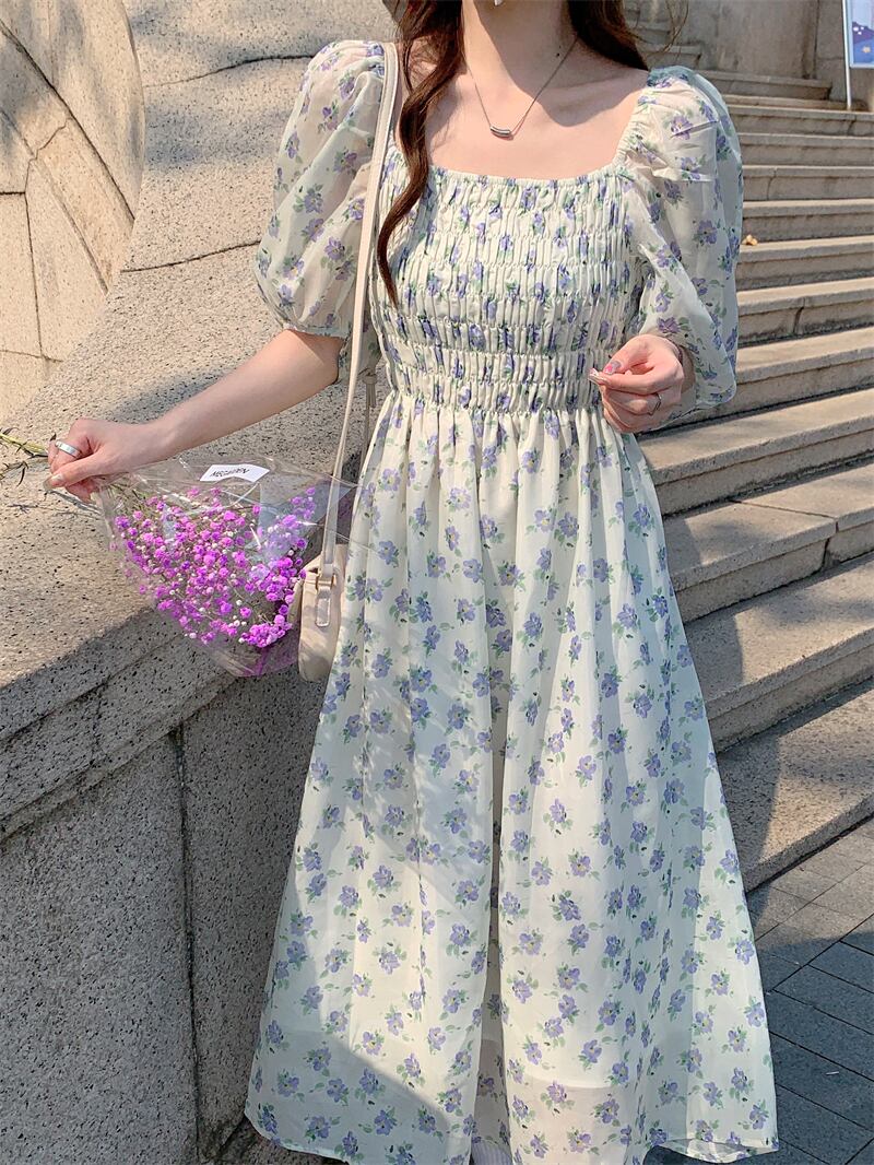 フローラルワンピース夏服カラーウェストロングスカート 夏物 花柄 スクウェア パフスリーブ ウエスト SYJ32237899077