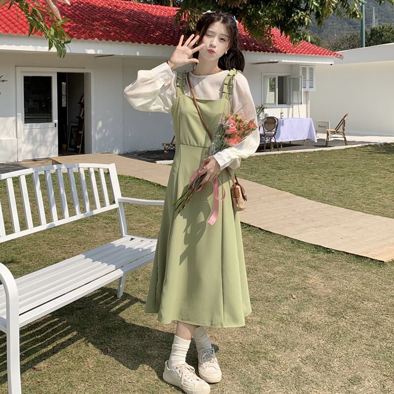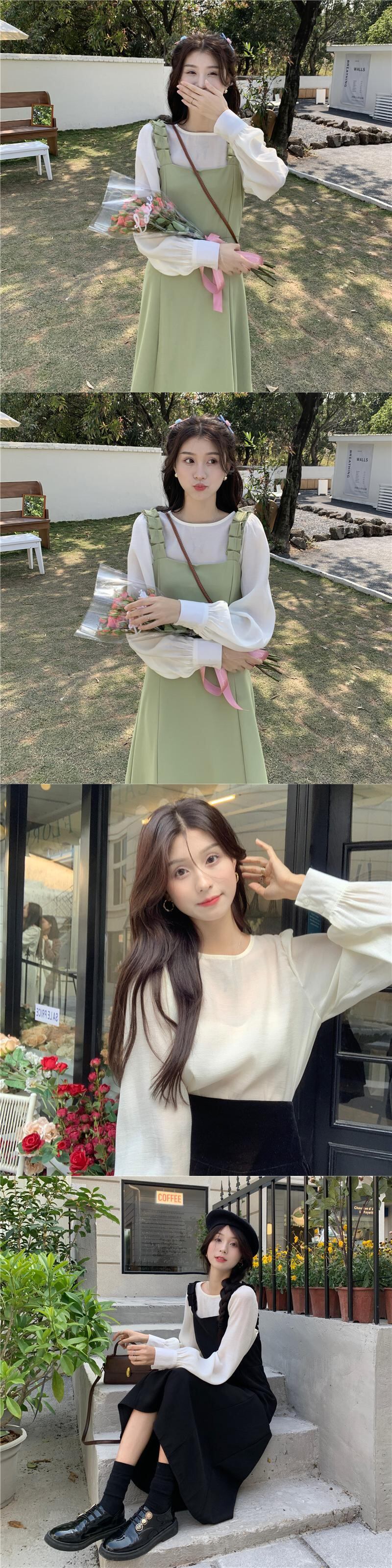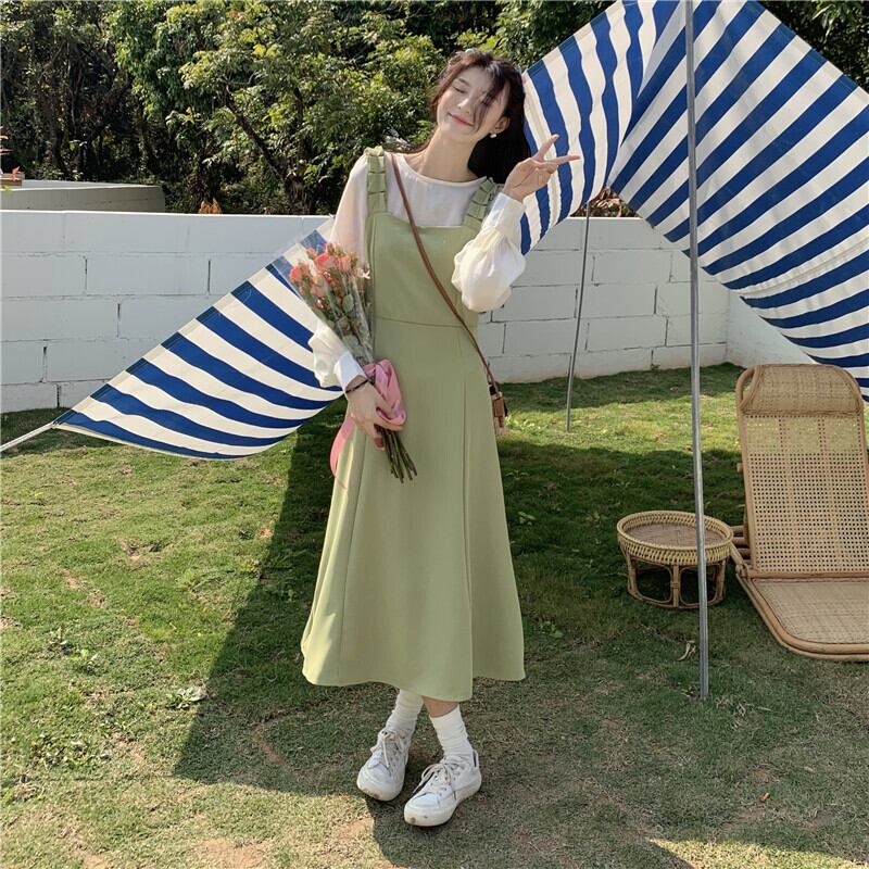 色:ワンピースベージュの日焼け止めシャツ,緑のサスペンダードレスワンピース,ブラックサスペンダードレスワンピース